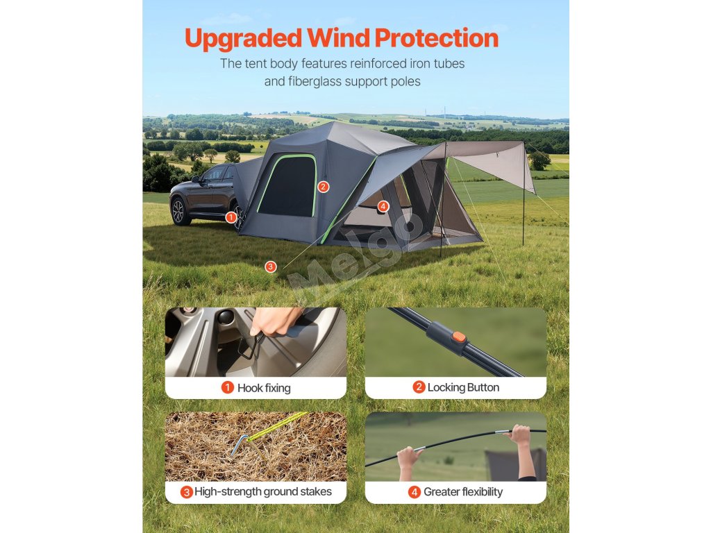 Tento stan do auta pre vozidlá SUV, vyrobený z tkaniny Oxford 210T a s pevnými švami, poskytuje tepelnú izoláciu aj vodotesnosť s označením PU2000. Účinne zabraňuje prenikaniu dažďa, vďaka čomu zostanete vo vnútri v suchu.