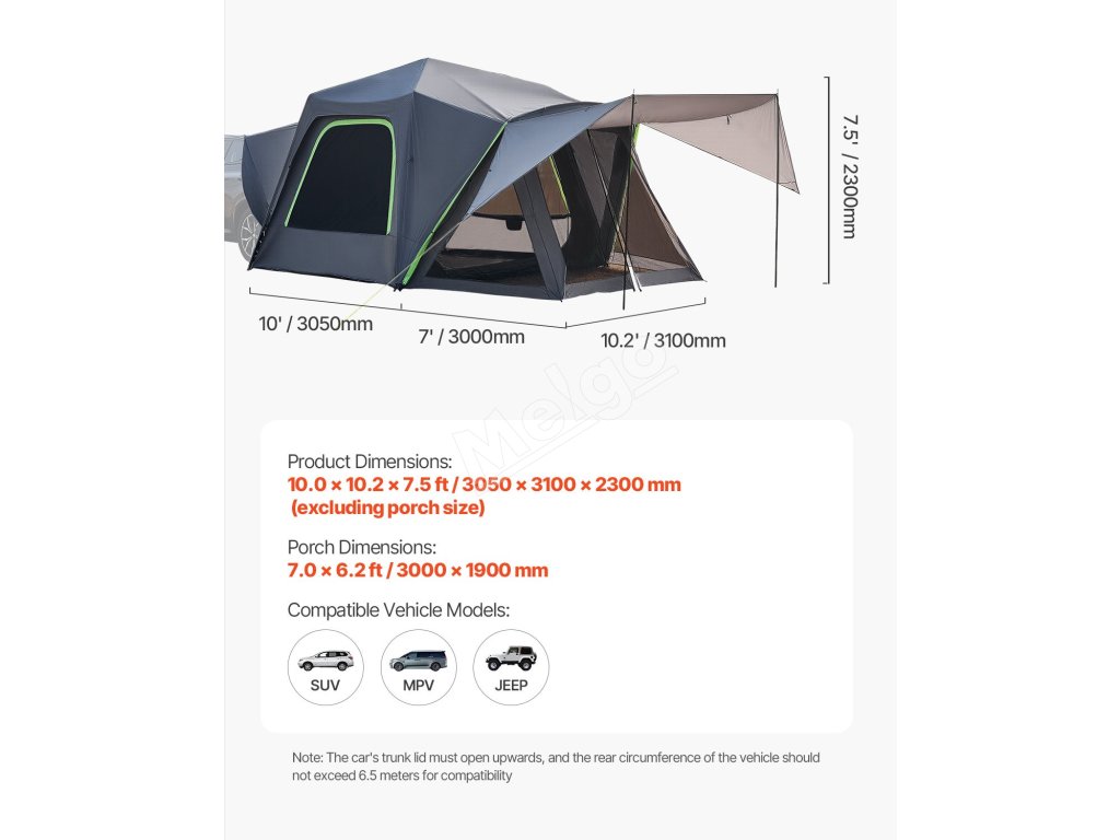 Náš stan pre vozidlá SUV je vhodný pre väčšinu stredne veľkých a malých vozidiel SUV. Pokiaľ sa váš zadný kryt otvára smerom nahor a obvod zadnej časti je menší ako 6,5 m, tento stan bude fungovať. Nie je kompatibilný s bočným alebo dvojitým otváraním kufra, ale môžete ho používať aj samostatne bez pripevnenia k vozidlu.