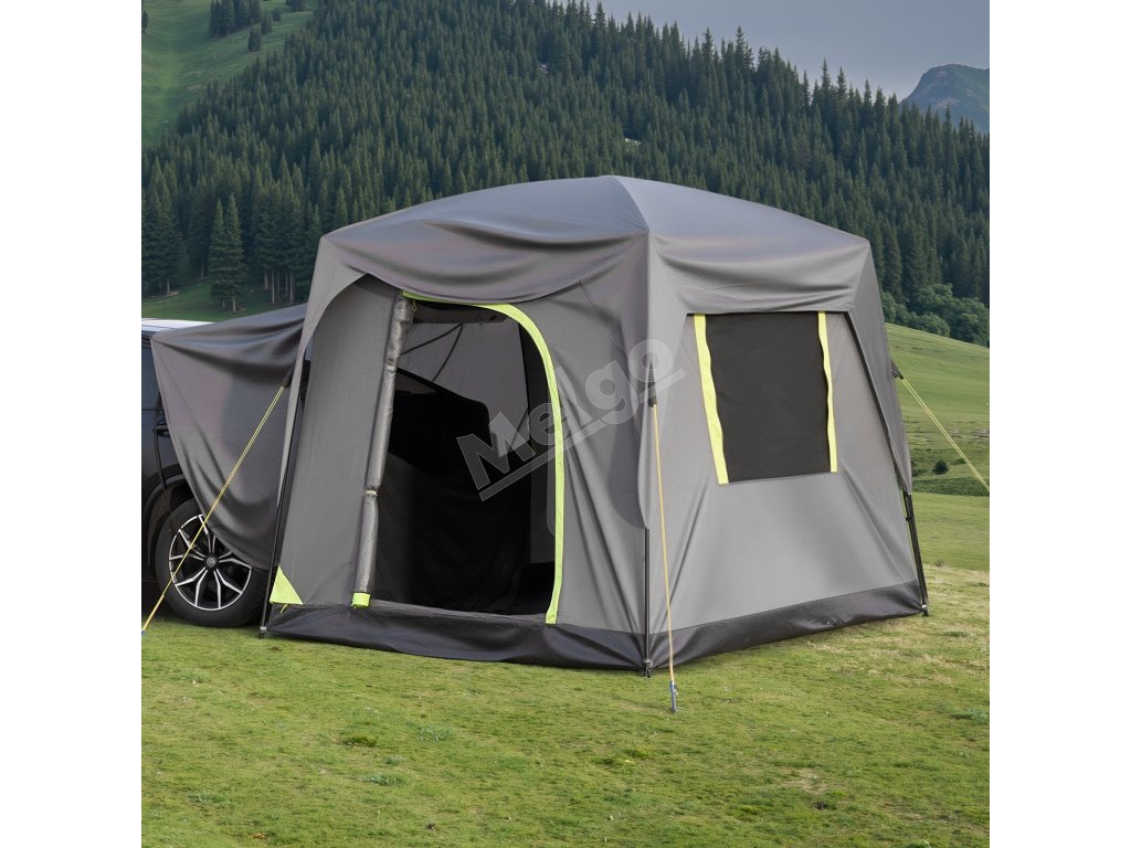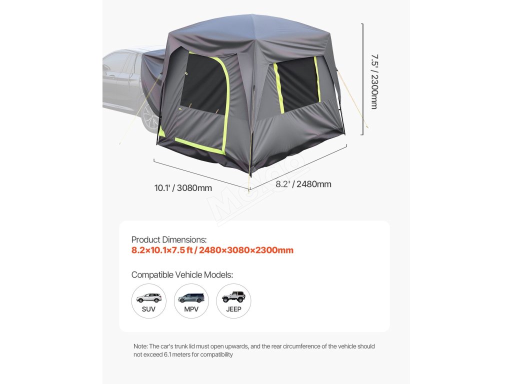 Náš stan pre vozidlá SUV je vhodný pre väčšinu stredne veľkých a malých vozidiel SUV. Pokiaľ sa váš zadný kryt otvára smerom nahor a obvod zadnej časti je nižší ako 6,1 m, tento stan bude fungovať. Nie je kompatibilný s bočným alebo dvojitým otváraním kufra, ale môžete ho používať aj samostatne bez pripevnenia k vozidlu.