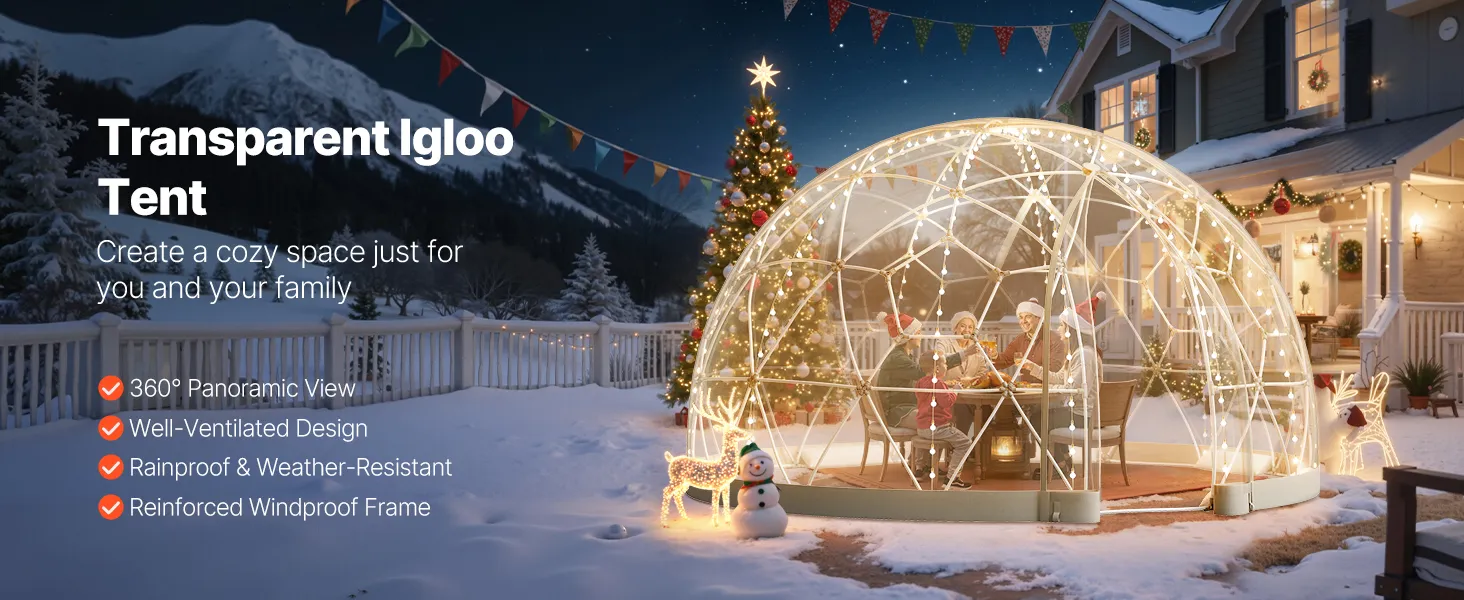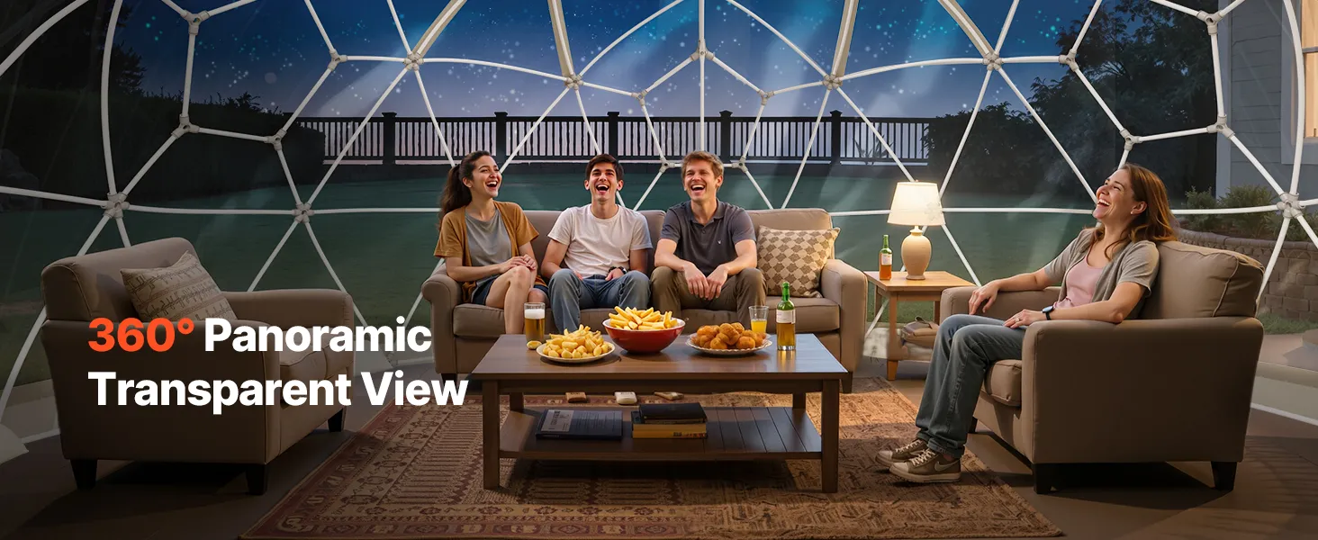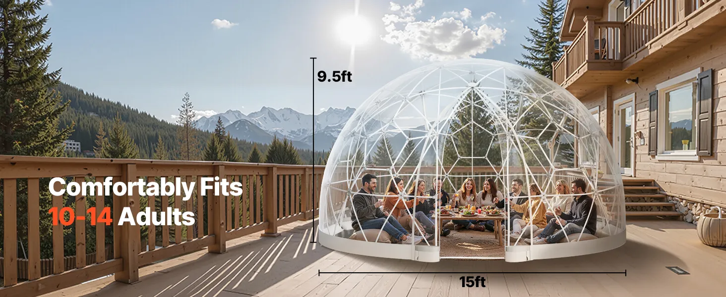 Bublinový iglu stan 4.5×2.7 m, priehľadný, pre 4-7 osôb, s oknom