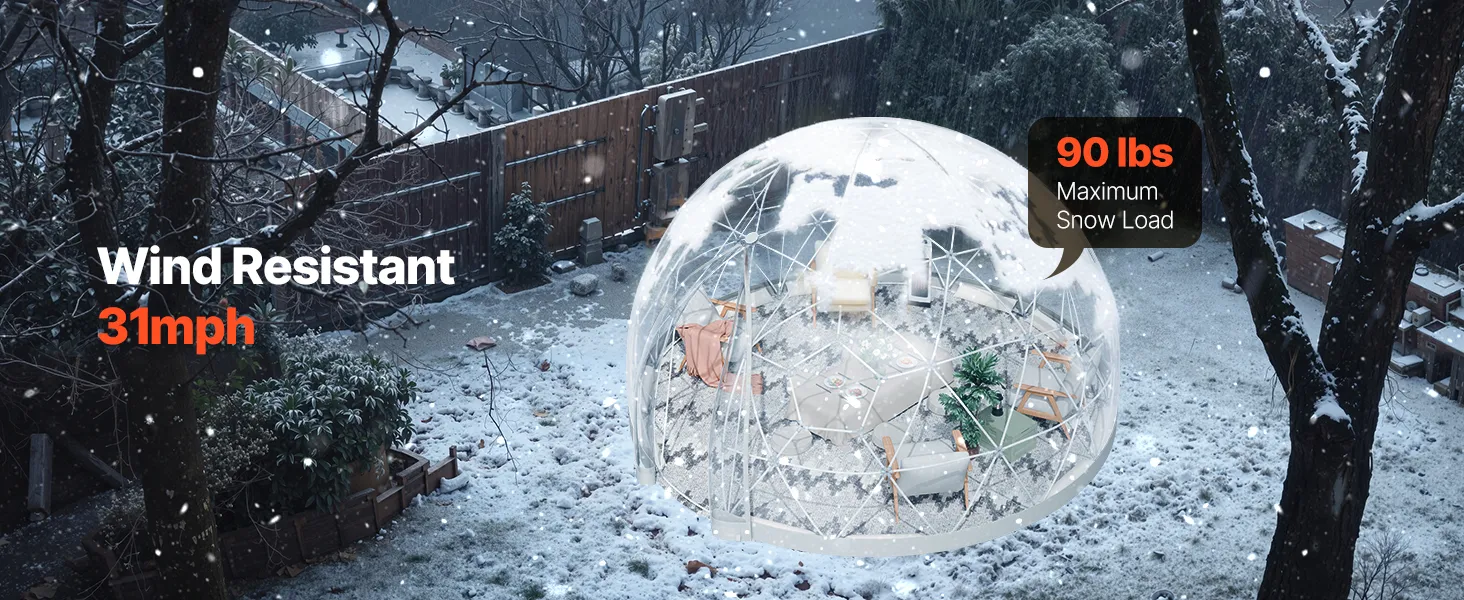 A1: Tento kupolový stan je určený na celoročné použitie. Vďaka 0,3 mm hrubému PVC poťahu odolnému voči chladu a zosilnenému vetruvzdornému rámu odoláva teplotám od -15 °C do 40 °C, čím poskytuje vynikajúcu izoláciu a ochranu. Pri zimnom používaní odporúčame umiestniť do stanu ohrievač, aby sa udržalo teplé a príjemné prostredie.