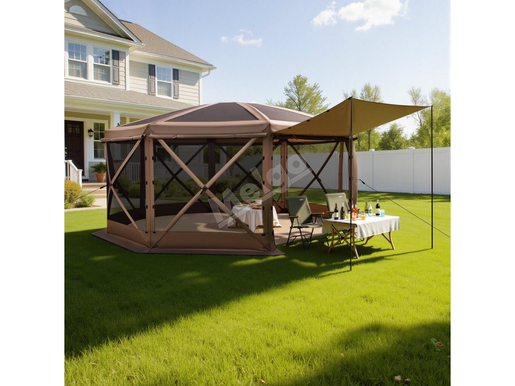 Veľký altánok so zástenou ponúka priestrannú plochu na aktivity a slnečnú clonu na stretnutia rodiny a priateľov. veľkosť 12x12 stôp pojme 8-10 osôb. 7.strieška vysoká 2 ft umožňuje pohodlné státie a pohyb.