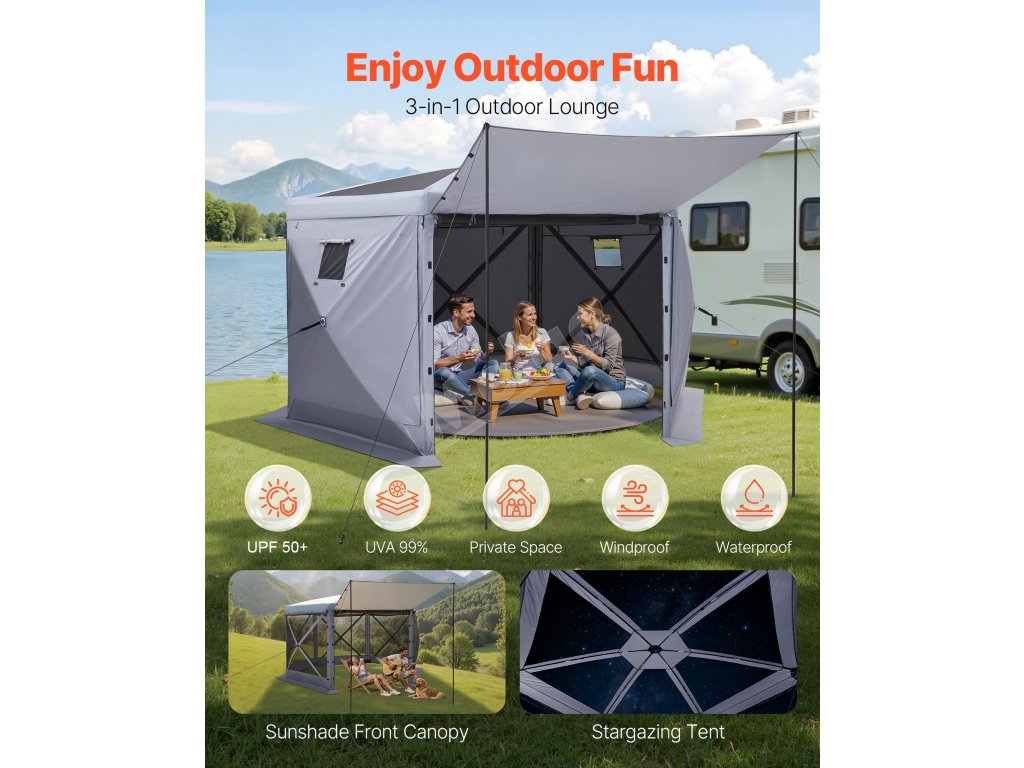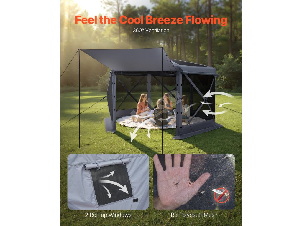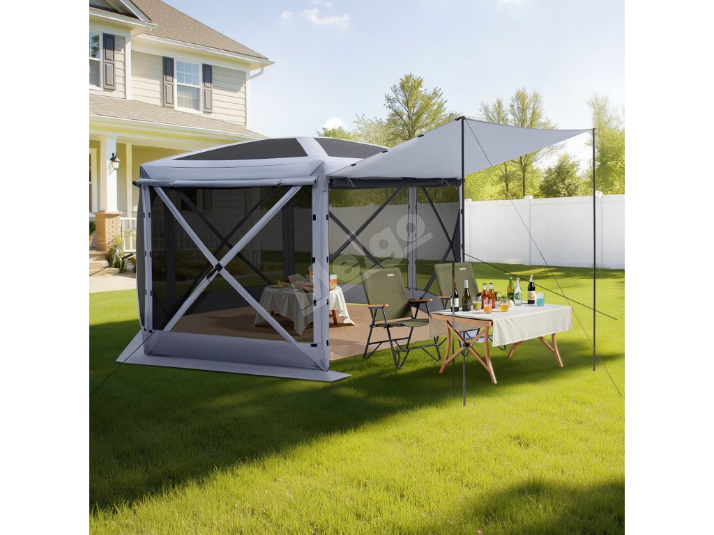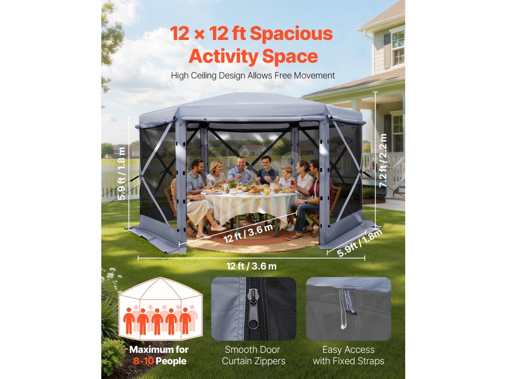 Veľký altánok so zástenou ponúka priestrannú plochu na aktivity a slnečnú clonu na stretnutia rodiny a priateľov. veľkosť 12x12 stôp pojme 8-10 osôb. 7.strieška vysoká 2 ft umožňuje pohodlné státie a pohyb.