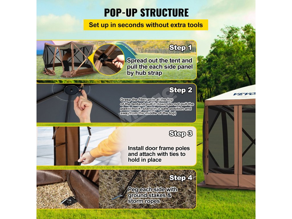 Stan VEVOR camping gazebo screen je všestranným partnerom pre vaše vonkajšie dobrodružstvá. Vychutnajte si najlepší spôsob kempovania, párty na dvore, pikniky alebo trhy pod holým nebom. Užívajte si voľný čas štýlovo a pohodlne so spoločnosťou VEVOR!