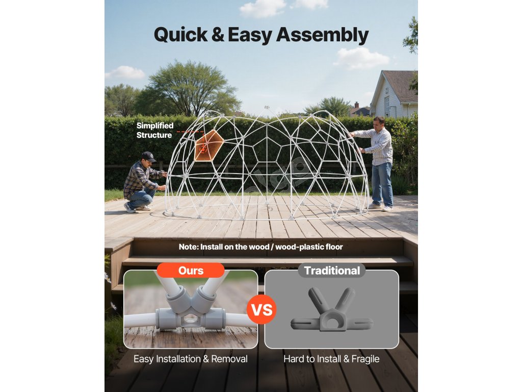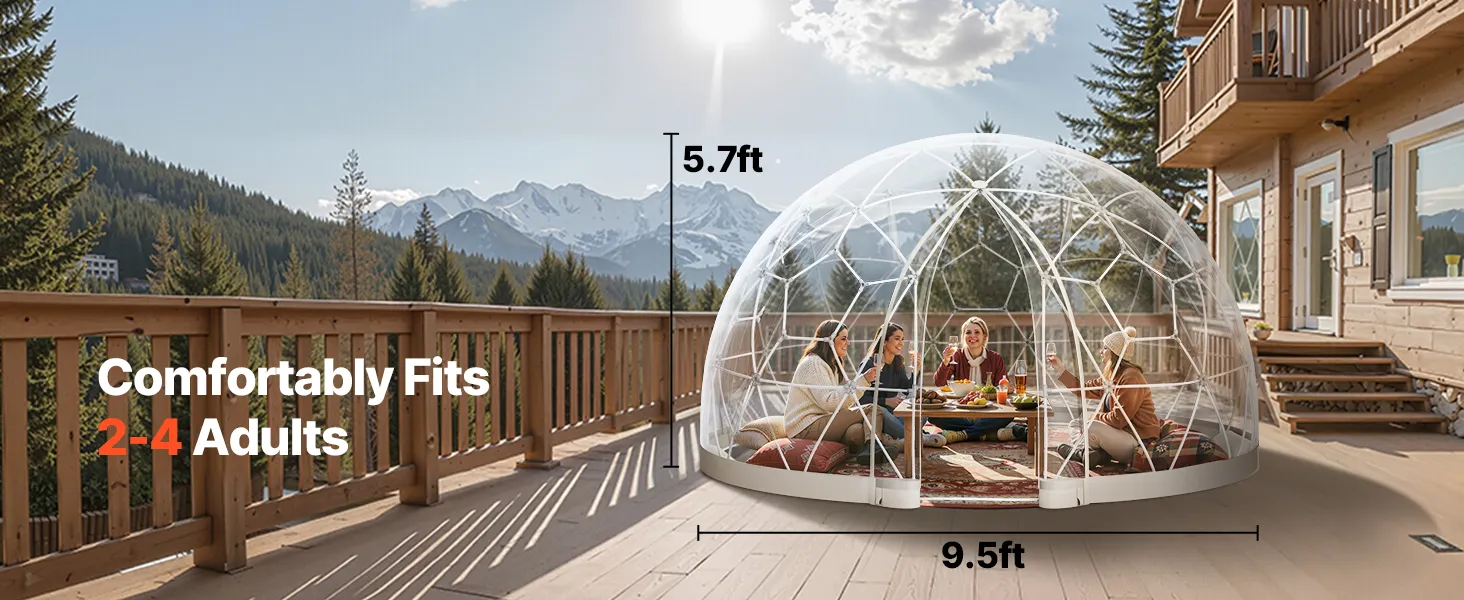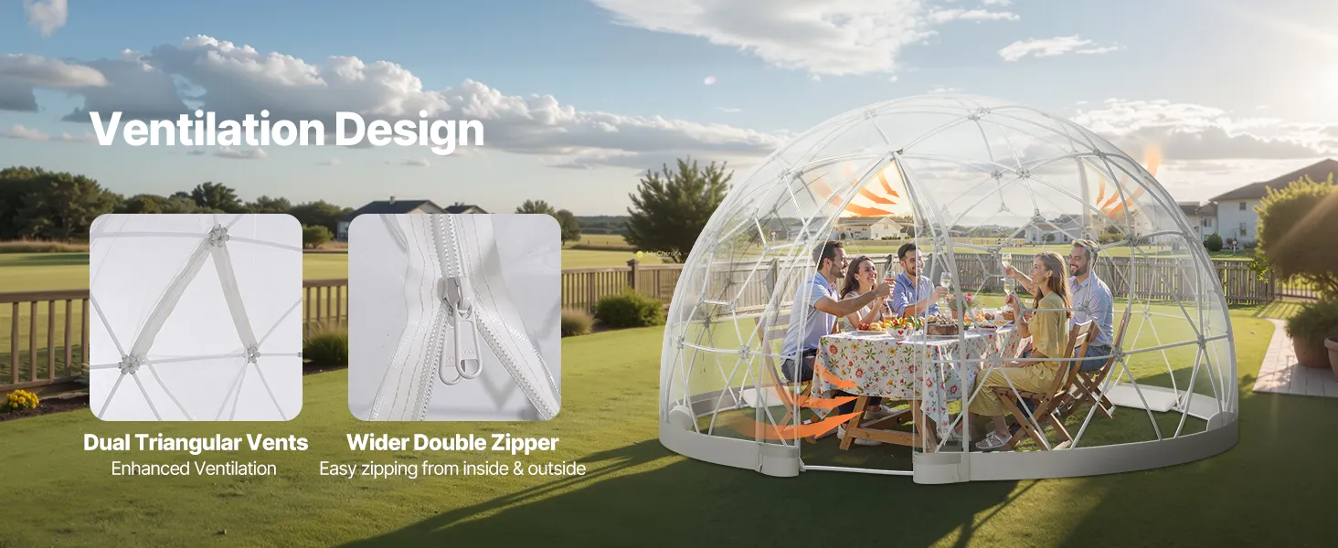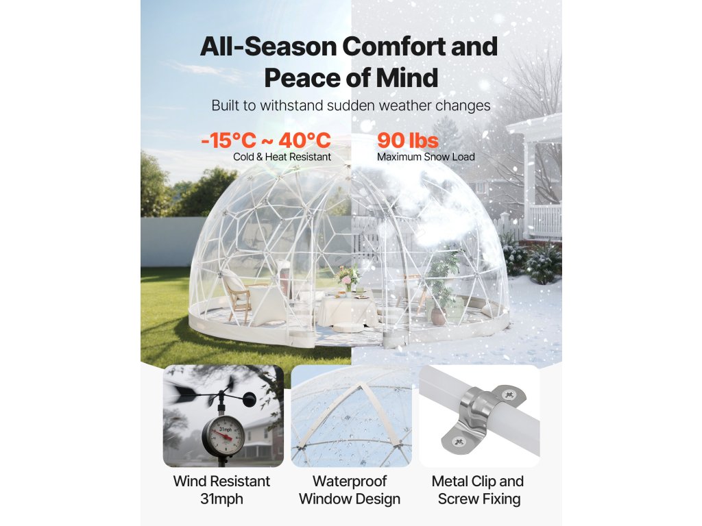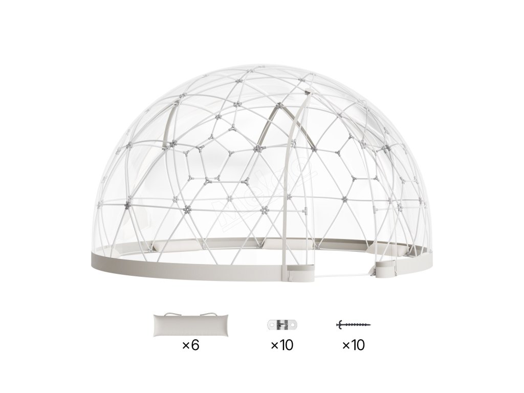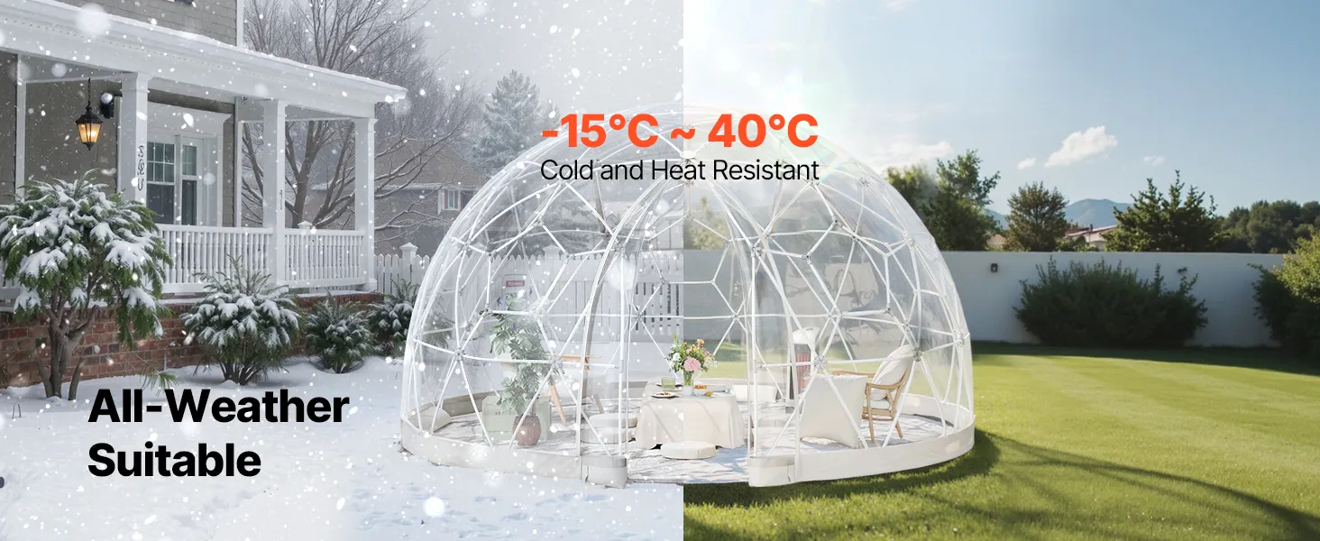 A1: Tento kupolový stan je určený na celoročné použitie. Obal z PVC odolného voči chladu s hrúbkou 0,3 mm a vetruvzdorný rám odolávajú teplotám (od 5°F do 104°F), čo zaručuje vynikajúcu izoláciu a ochranu. Pri zimnom používaní odporúčame umiestniť dovnútra ohrievač.