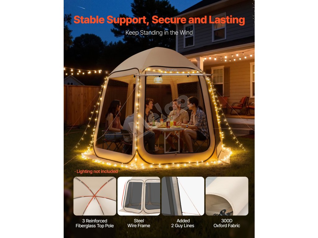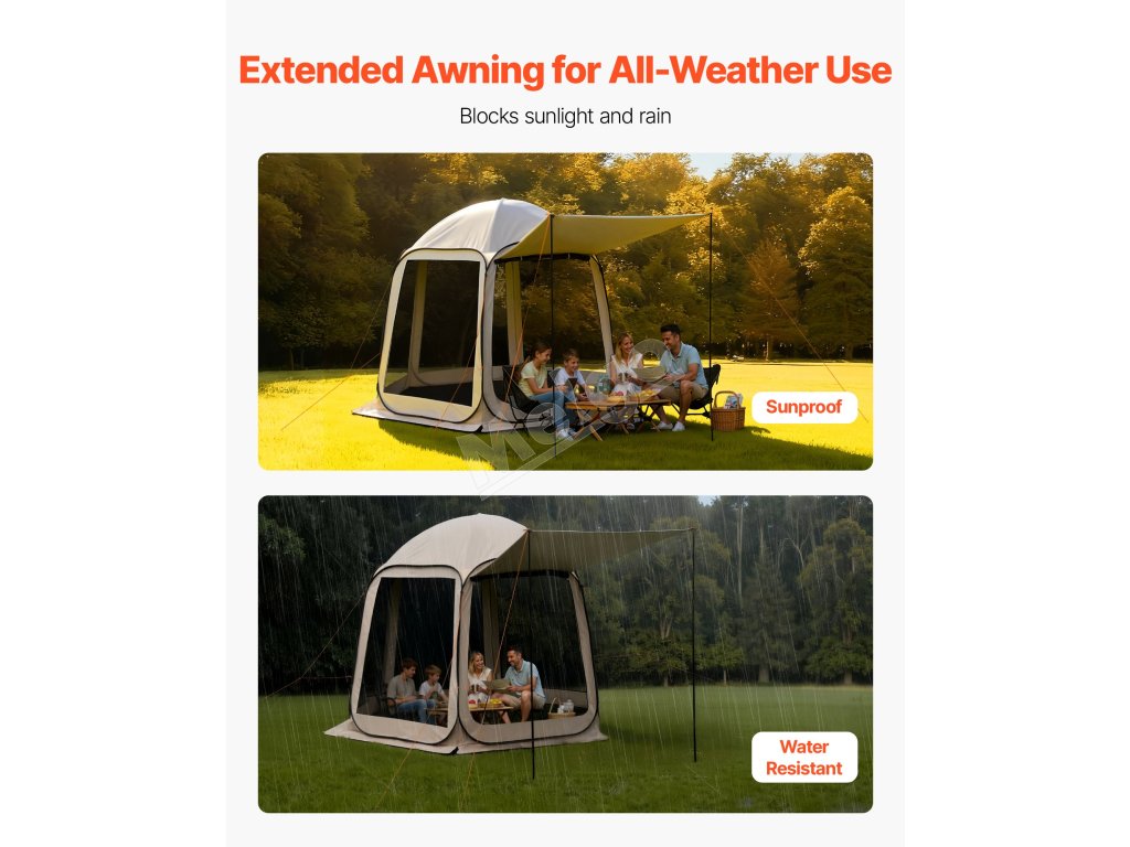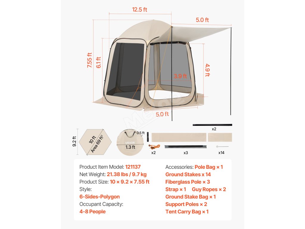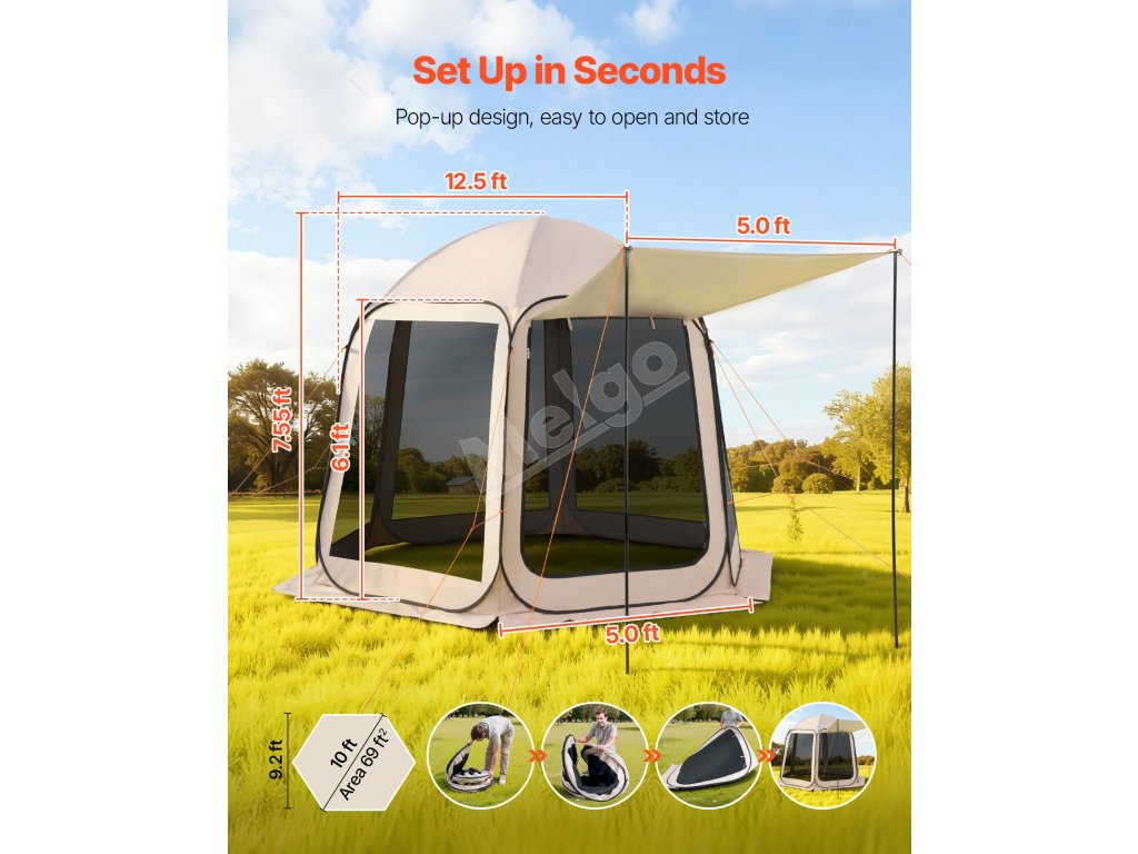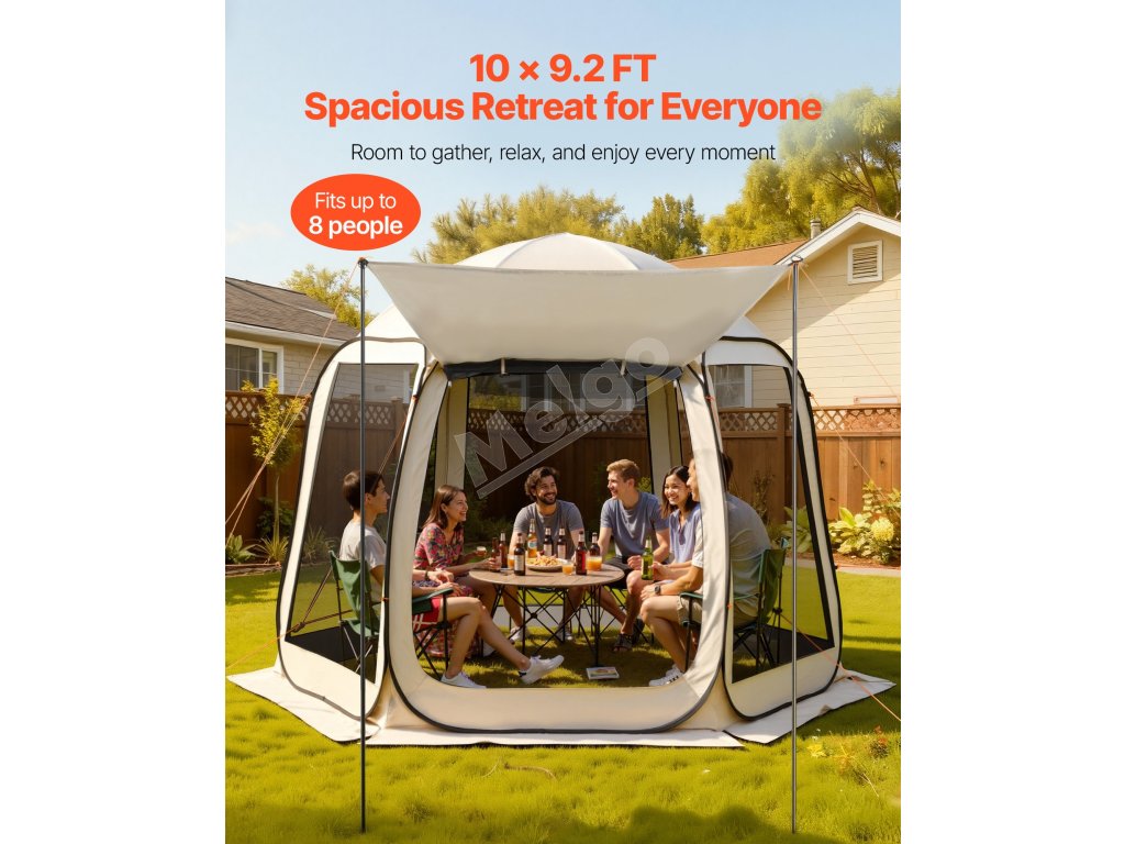 Do tohto vyskakovacieho stanu s paravánom a malou strieškou s priestrannými rozmermi 10 x 9,2 ft sa pohodlne zmestí až 8 osôb. Je ideálny na rozloženie stoličiek a vybavenia a poskytuje chladné, tienisté miesto na oddych vonku.