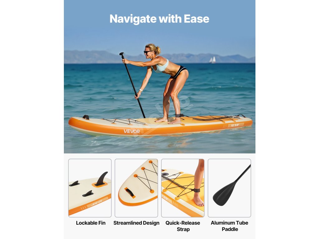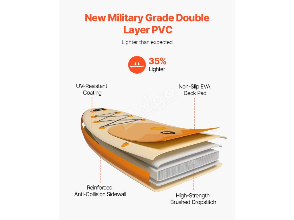 Vnútro stojanovej dosky na pádlovanie vyrobené z nového ultraľahkého dvojvrstvového PVC vojenskej triedy je vybavené vysokokvalitnou kartáčovanou technológiou, ktorá zvyšuje tuhosť dosky a znižuje jej náchylnosť na deformáciu alebo poškodenie. Ergonomická rukoväť uľahčuje prenášanie jednou rukou.