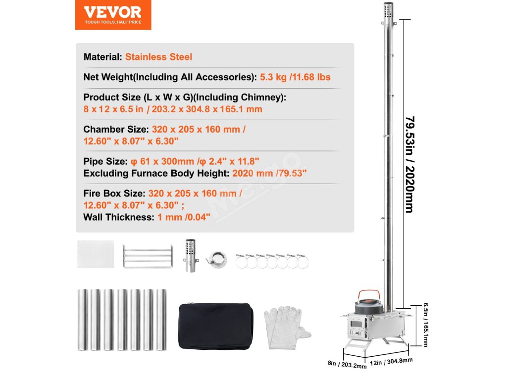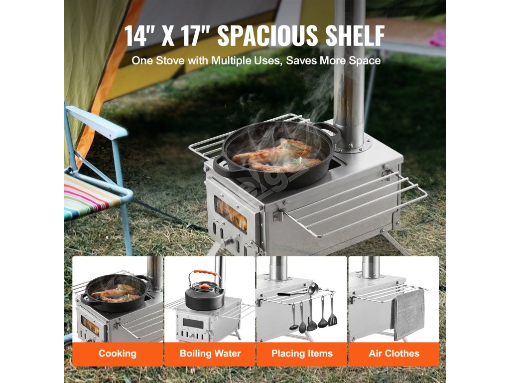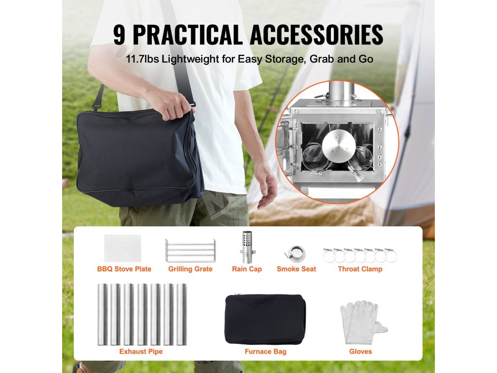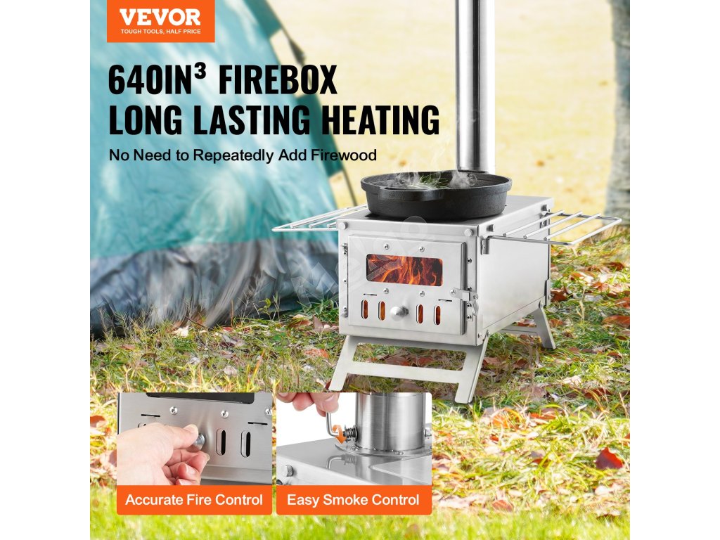 Zhrubnuté panely poskytujú odolnosť a zabraňujú deformácii. Tento mini sporák na drevo je vyrobený zo zliatiny ocele odolnej voči korózii, takže odolá aj náročným podmienkam.