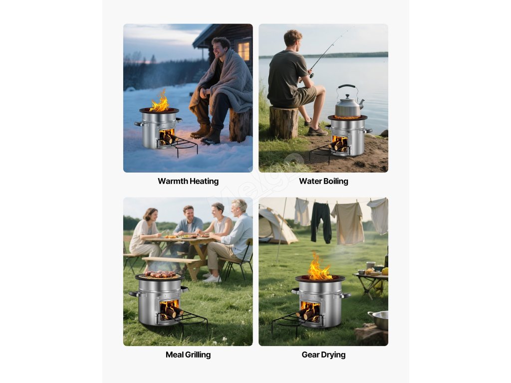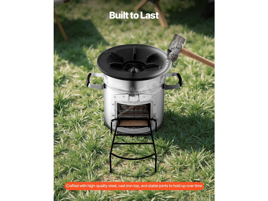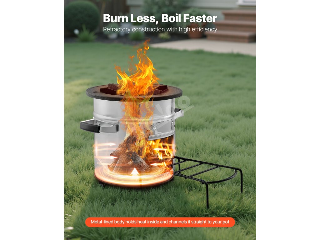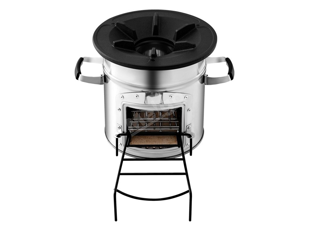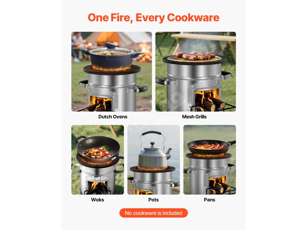 Náš raketový varič na drevo je kompatibilný s bežným kempingovým riadom vrátane panvíc, woku, holandských rúr a sieťových grilov. Rebrovaná podporná plocha podporuje rovnomerné rozloženie tepla.