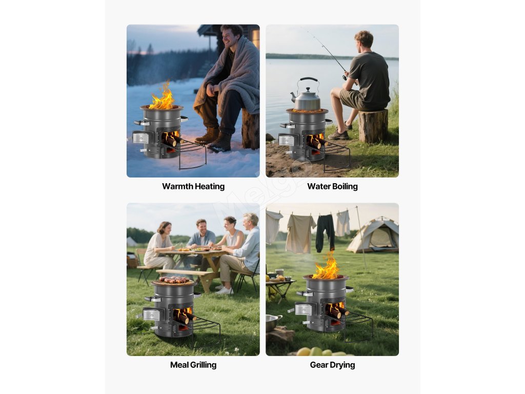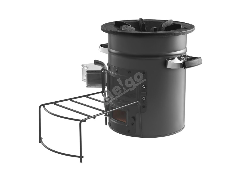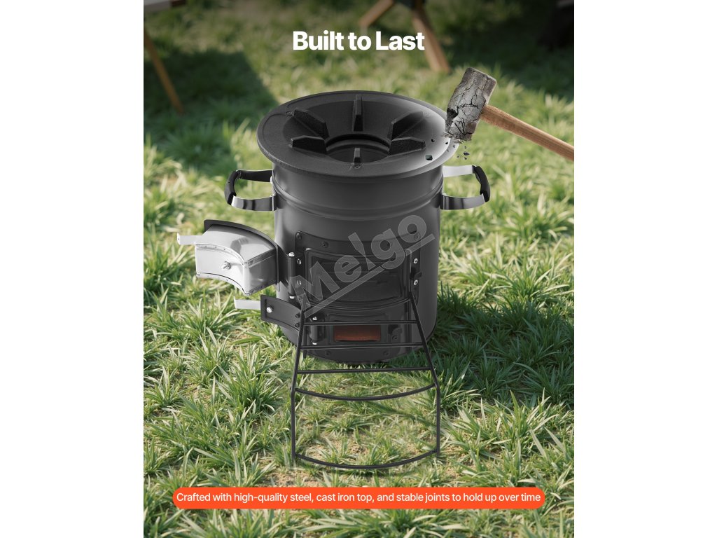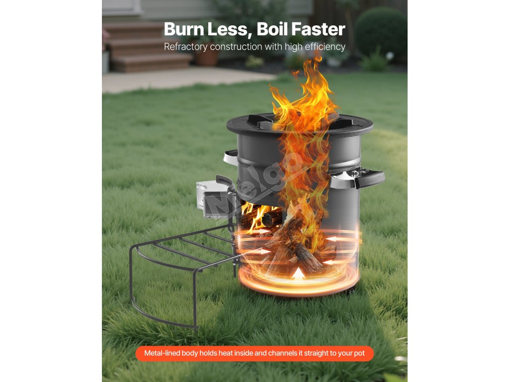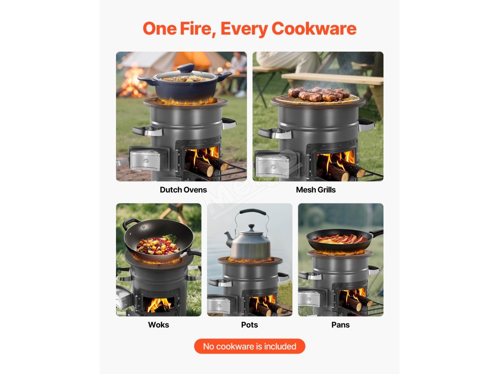 Náš raketový varič na drevo je kompatibilný s bežným kempingovým riadom vrátane panvíc, woku, holandských rúr a sieťových grilov. Rebrovaná podporná plocha podporuje rovnomerné rozloženie tepla.