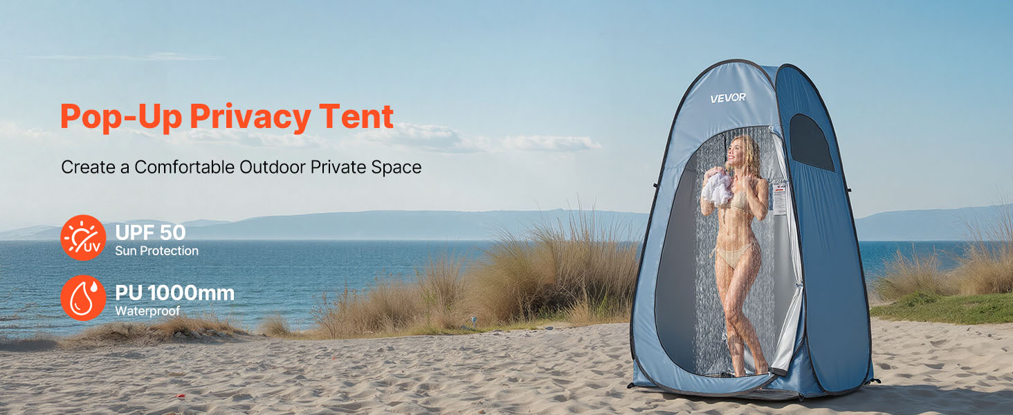 Náš skládací sprchový stan je vyrobený z materiálu s ochranou proti slnku UPF 50 a vodoodolnej tkaniny PU2000 mm, ktorý chráni pred slnkom a dažďom na pláži alebo v kempingu a udržiava vnútro suché a pohodlné.