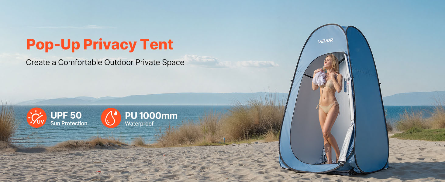 Náš skládací sprchový stan je vyrobený z materiálu s ochranou proti slnku UPF 50 a vodoodolnej tkaniny PU2000 mm, ktorý chráni pred slnkom a dažďom na pláži alebo v kempingu a udržiava vnútro suché a pohodlné.