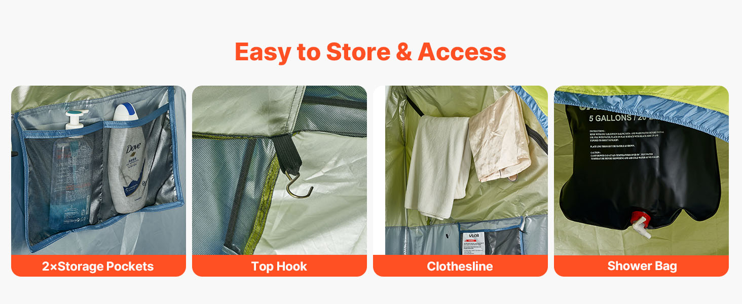 Náš vonkajší sprchový stan obsahuje niekoľko úložných vreciek, šnúru na bielizeň a závesné háčiky, vďaka čomu je jednoduché uložiť uteráky, oblečenie, telefóny a iné predmety. Tieto premyslené funkcie poskytujú pohodlnejší a komfortnejší zážitok.