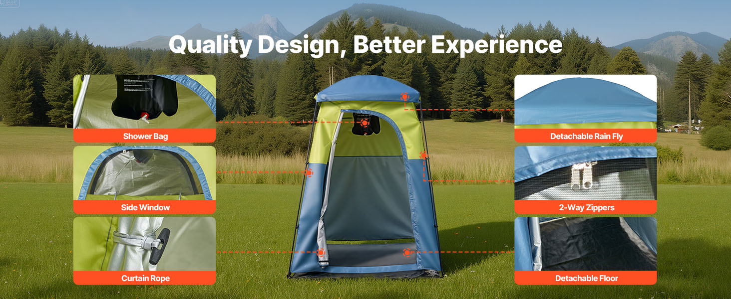 Odnímateľná plachta proti dažďu pomáha ľahko zvládnuť ľahké dažďové prehánky, zatiaľ čo odnímateľná podlahová rohož funguje dobre na tráve a piesku a je ľahko čistiteľná. Tieto flexibilné dizajny umožňujú sprchovému stanu prispôsobiť sa rôznym vonkajším prostrediam.