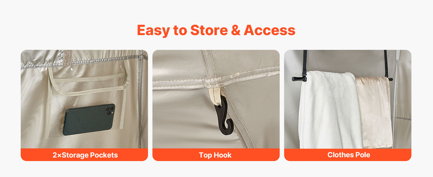 Náš vonkajší sprchový stan obsahuje niekoľko úložných vreciek, šnúru na oblečenie a háčiky na zavesenie, vďaka čomu si v ňom ľahko uložíte uteráky, oblečenie, telefóny a iné predmety. Tieto premyslené funkcie poskytujú pohodlnejší a komfortnejší zážitok.