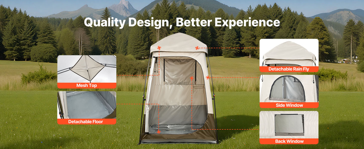 Odnímateľná dažďová plachta pomáha ľahko zvládnuť slabú sprchu, zatiaľ čo odnímateľná podlahová podložka sa dobre používa na tráve a piesku a ľahko sa čistí. Vďaka týmto flexibilným konštrukciám sa sprchový stan prispôsobí rôznym vonkajším prostrediam.
