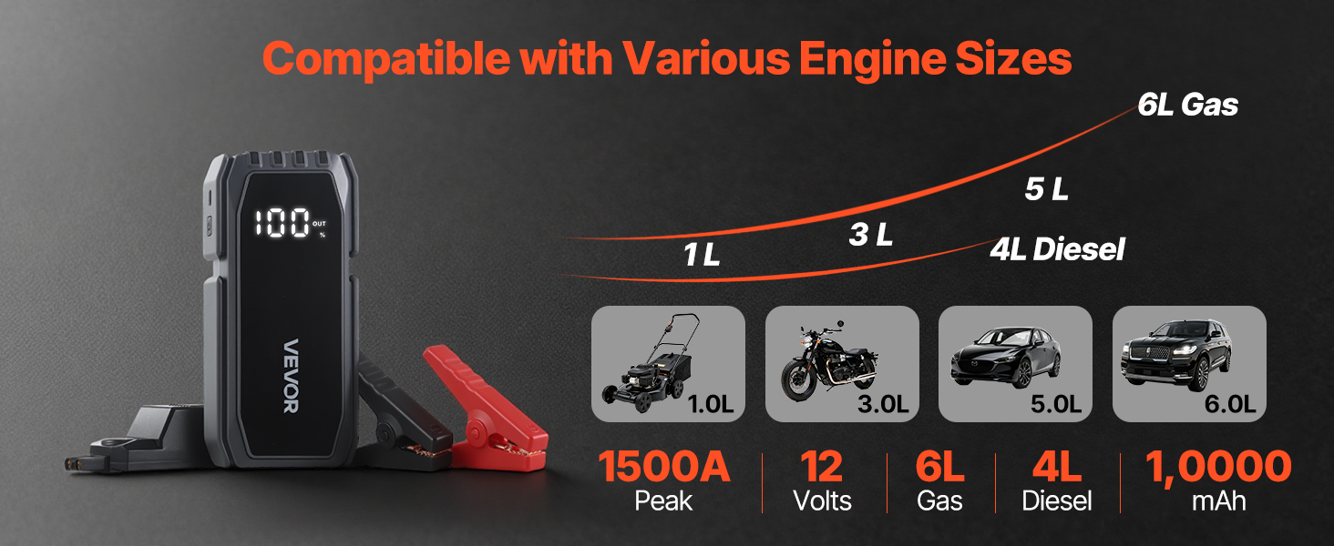 Naše štartovacie zariadenie pre autobatérie je kompatibilné s automobilmi, motocyklami a inými vozidlami a bez problémov dokáže naštartovať 6-litrové benzínové motory a 4-litrové dieselové motory.
