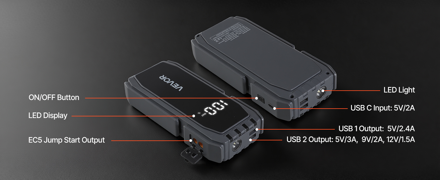 Tento štartér batérií je vybavený multimodálnym LED svetlom (stále, stroboskopické a SOS) a poskytuje jasné osvetlenie v núdzových situáciách. USB porty vám umožňujú nabíjať telefóny, tablety a iné zariadenia, vďaka čomu zostanete pripojení aj v prípade, že sa batéria vybije.