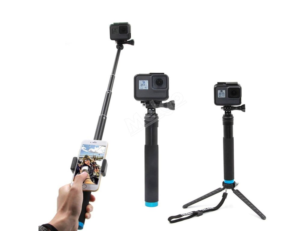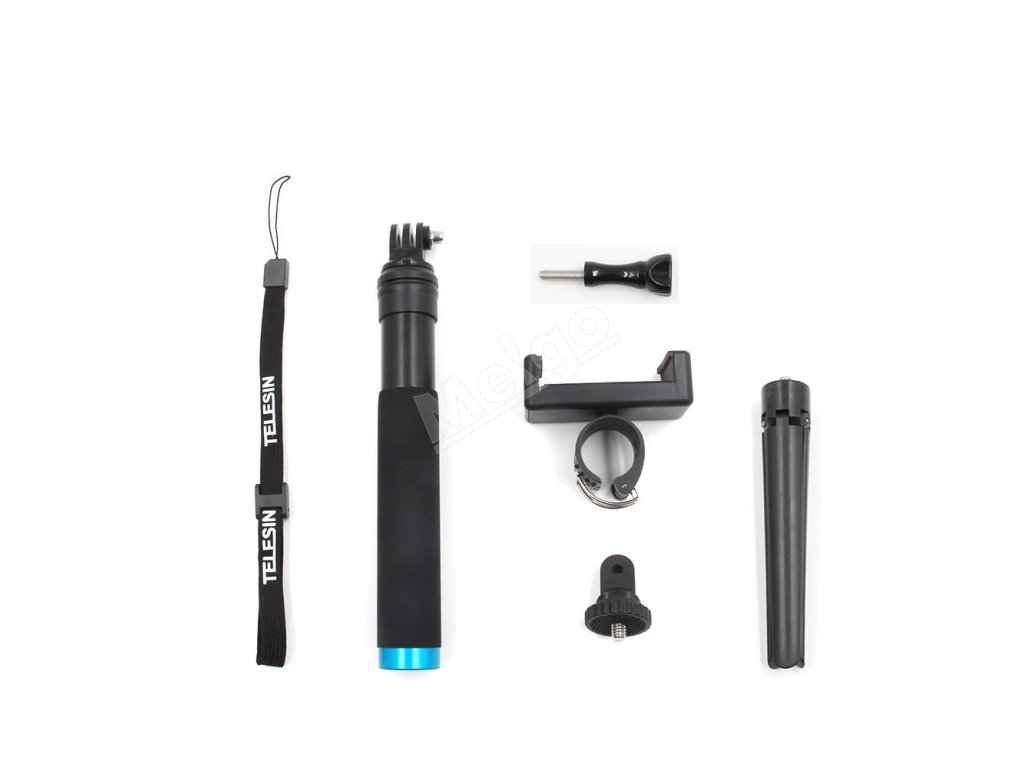 Selfie tyč Telesin s nastaviteľnou dĺžkou z hliníkovej zliatiny vám poskytuje ešte viac možností na nahrávanie pomocou športovej kamery alebo telefónu. Vďaka protišmykovej rukoväti sa používa veľmi pohodlne. Vyniká tiež značnou odolnosťou a v zloženom stave je neuveriteľne kompaktný. Priložený statív umožňuje používať toto praktické príslušenstvo aj ako statív.