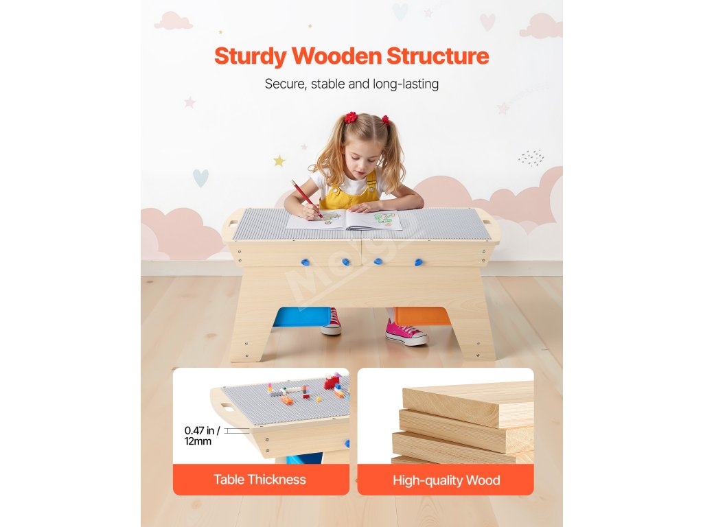 Stolík na hranie pre batoľatá má zaoblené rohy, aby bolo vaše dieťatko v bezpečí. Stabilný stôl na dlhodobé používanie a leštený drevený povrch je hladký, čo zaručuje, že sa na ňom nevytvoria triesky ani škrabance. Rodičia si môžu oddýchnuť s vedomím, že je bezpečný.