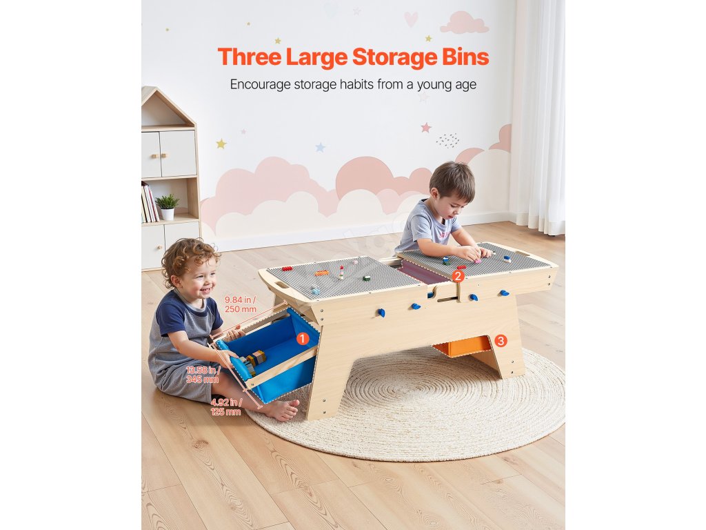 Udržujte poriadok vďaka 3 úložným boxom z netkanej textílie, ktoré sú ideálne na hračky, knihy a kocky. Výsuvné koše dreveného stolíka na aktivity umožňujú deťom samostatne si usporiadať veci a podporujú ich v budovaní zdravých návykov počas hry!