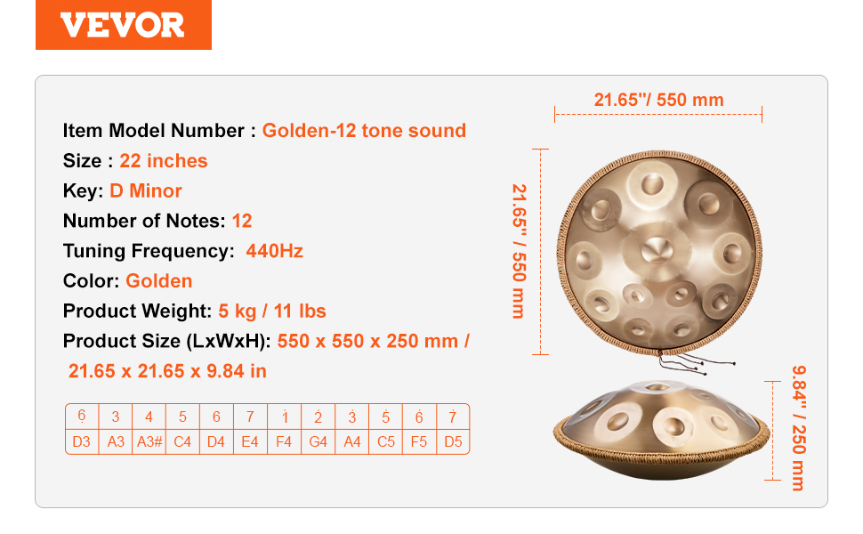 Tento 22-palcový handpan bubon D-mol je vyrobený z vysokokvalitnej uhlíkovej ocele a pokrýva 12 tónov, ktoré majú hlbokú zlatú farbu. Je ideálny pre začiatočníkov, ktorí s ním môžu rýchlo začať a vďaka príjemnému, čistému a dlhotrvajúcemu tónu vám prinesie maximálny pôžitok z hudby.