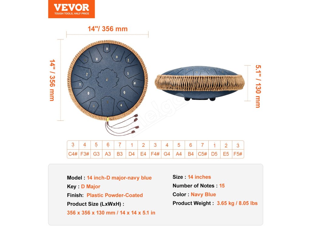 Tento 14-palcový oceľový bubon s jazýčkom v tónine D dur, starostlivo vyrobený z uhlíkovej ocele, pokrýva 15 nôt v hlbokej námorníckej farbe. Je ideálny pre začiatočníkov, ktorí chcú rýchlo začať, a poskytuje maximálny pôžitok z hudby vďaka príjemnému, čistému a dlhotrvajúcemu tónu.