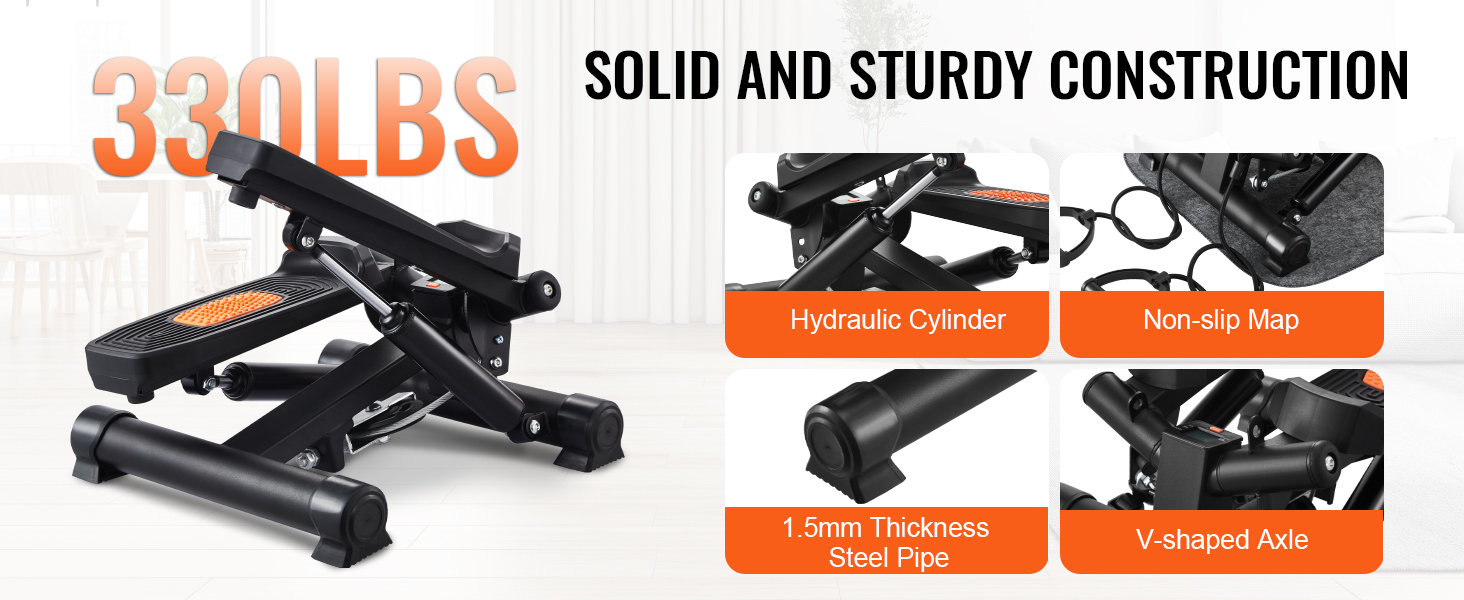 Hydraulický fitness stepper je vybavený 1,5 mm hrubým držiakom, ktorý zabezpečuje plynulý krokový pohyb, vďaka čomu si môžete vychutnať svoje cvičenie v tichosti. Vysokokvalitné pružiny chránia vaše kĺby, zvyšujú odolnosť a zvyšujú stabilitu a trvanlivosť, s nosnosťou 330 libier / 150 kg.