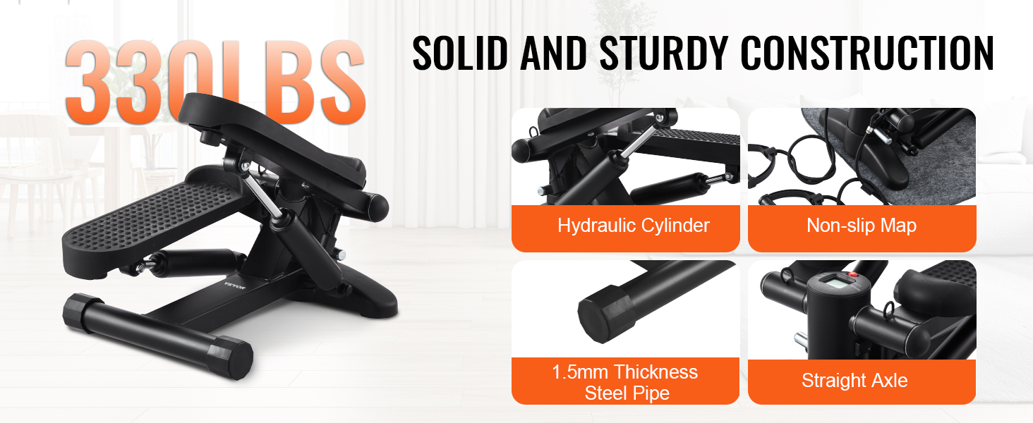Hydraulický fitness stepper je vybavený 1,5 mm hrubým držiakom, ktorý zabezpečuje plynulý krokový pohyb, vďaka čomu si môžete vychutnať svoje cvičenie v tichosti. Vysokokvalitné pružiny chránia vaše kĺby, zvyšujú odolnosť a zvyšujú stabilitu a trvanlivosť, s nosnosťou 330 libier / 150 kg.