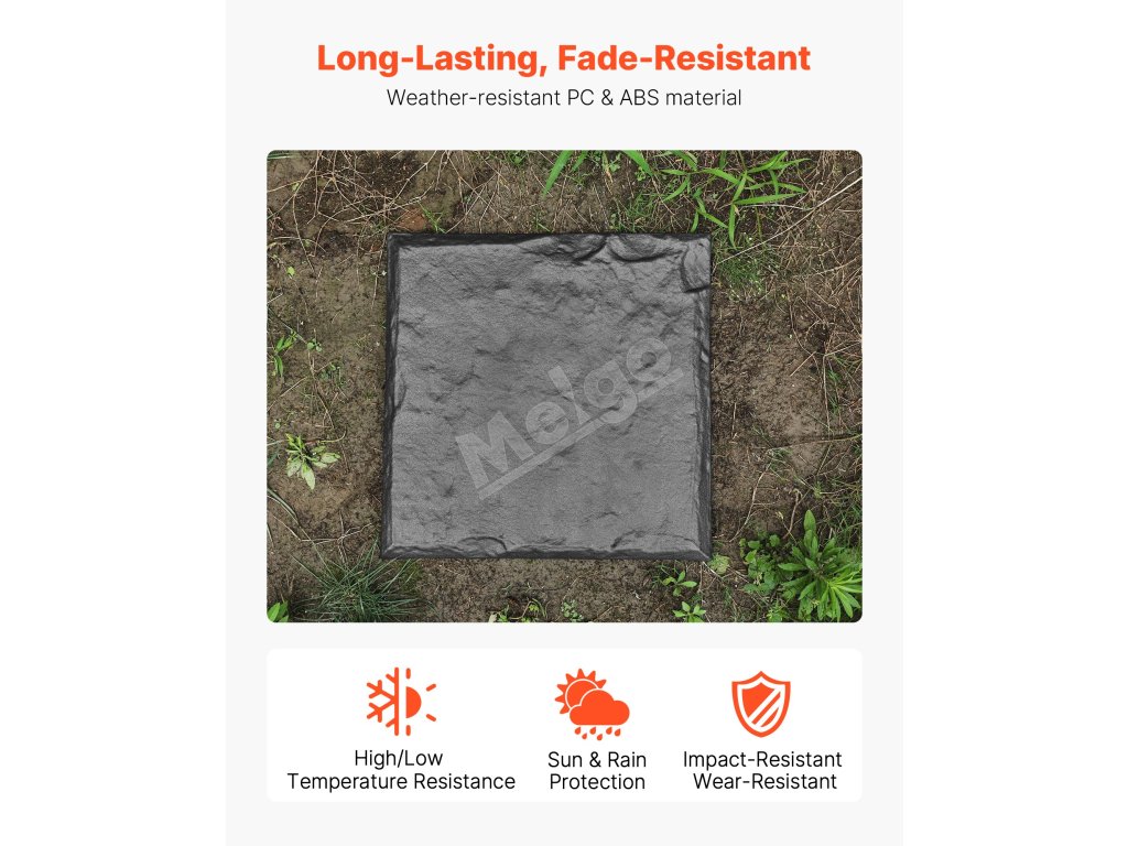 Tieto 4 ks záhradných nášľapných kameňov sú vyrobené z PC a ABS živice odolnej voči poveternostným vplyvom a odolávajú slnku, dažďu a mrazu bez deformácie alebo vyblednutia. Každý nášľapný kameň obsahuje 4 kolíky do zeme a zosilnenú základňu pre väčšiu stabilitu - ideálne pre domácnosti s deťmi a domácimi zvieratami.
