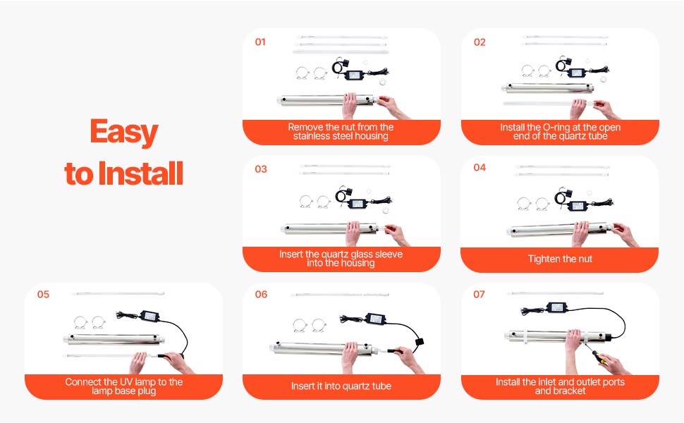 Náš UV čistič vody je navrhnutý s ohľadom na pohodlie používateľa a vyznačuje sa jednoduchými a rýchlymi krokmi inštalácie, vďaka čomu je proces nastavenia bezproblémový. Začnite s čistenou vodou v priebehu okamihu!