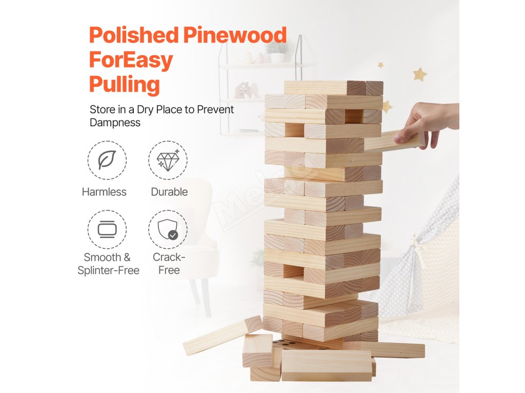 Táto hra s prevracajúcimi sa vežami je vyrobená z vysokokvalitného lešteného borovicového dreva, je netoxická, odolná a nárazuvzdorná. Hladký povrch bez triesok uľahčuje odstraňovanie blokov.