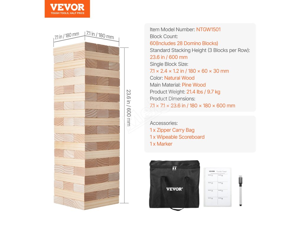 Súprava na bubnovanie obsahuje 60 blokov, každý s rozmermi 7,1" x 2,4" x 1,2". Medzi nimi je 28 blokov vybavených domino bodkami, vďaka čomu si môžete užívať nielen drevené veže, ale aj domino a prispôsobené hry. Pre ešte viac vzrušenia poskladajte vežu až do výšky 5 metrov!