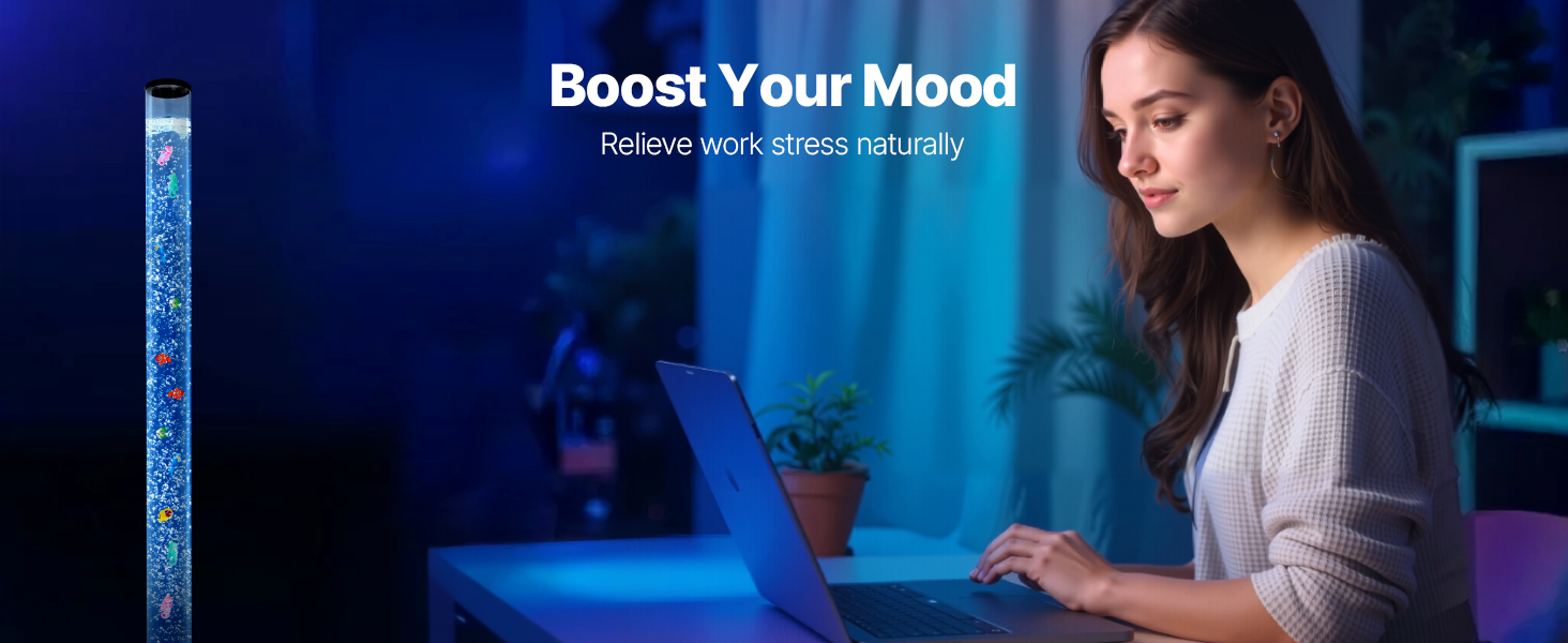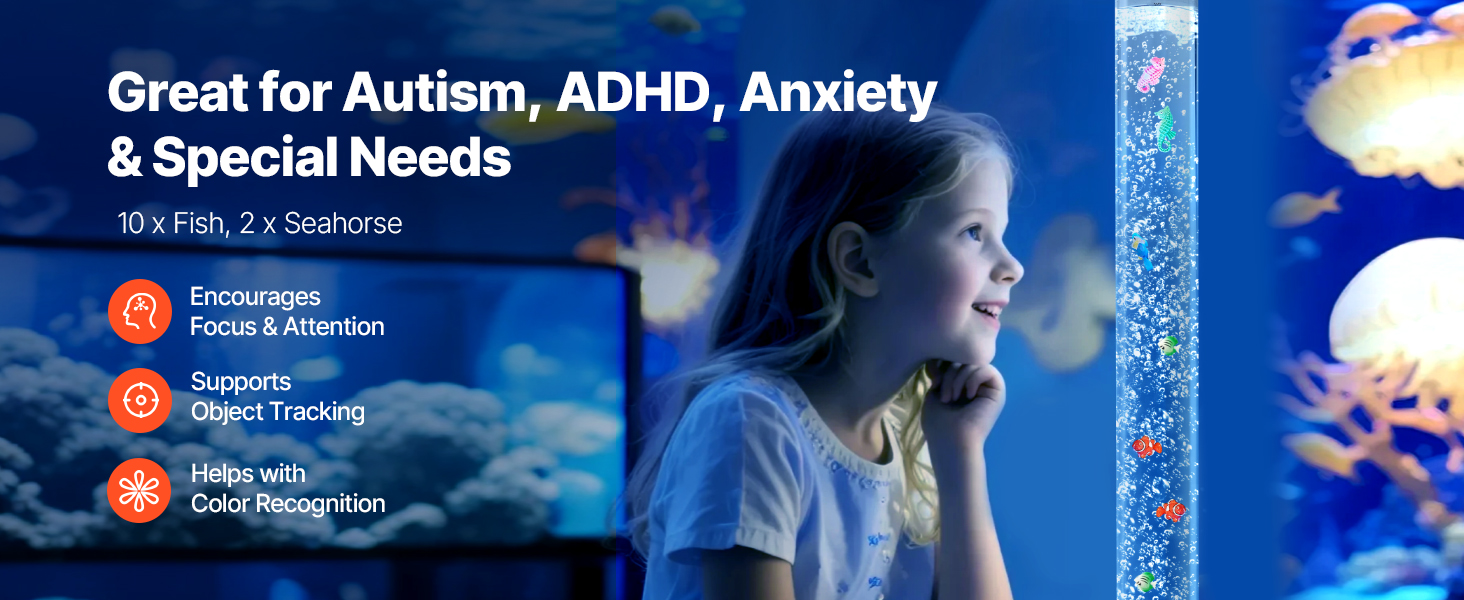 Napodobňuje upokojujúci pohyb morského života, ktorý pomáha znižovať stres. Naša bublinková lampa s rybičkami je ideálna na zmiernenie autizmu, ADHD a úzkosti.