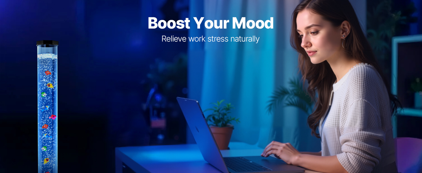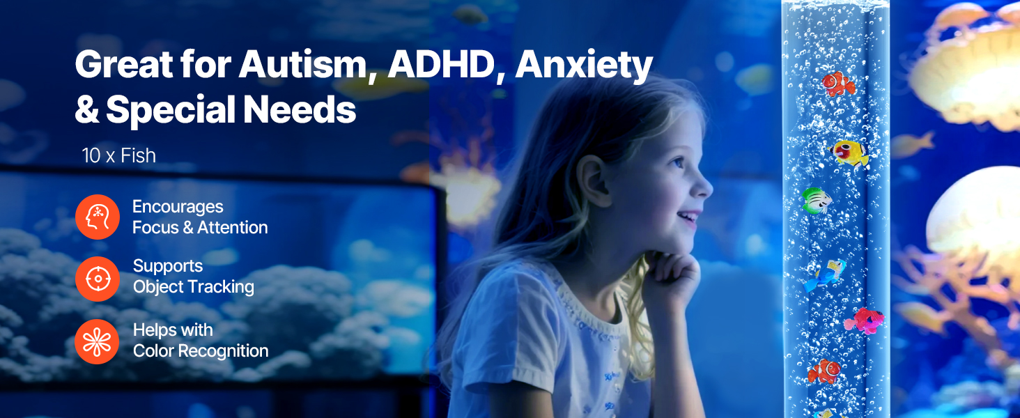 Napodobňuje upokojujúci pohyb morského života, ktorý pomáha znižovať stres. Naša bublinková lampa s rybičkami je ideálna na zmiernenie autizmu, ADHD a úzkosti.