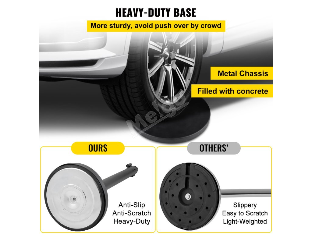 Základňa našej zábrany na kontrolu davu je pokrytá nehrdzavejúcou oceľou a vyplnená odolným betónom. Je teda protišmyková a proti poškriabaniu, neohrozuje pohyb a prevrátenie. Takáto zosilnená konštrukcia zvyšuje tvrdosť stĺpika, ktorý kopíruje pri náhodnom silnom stlačení.