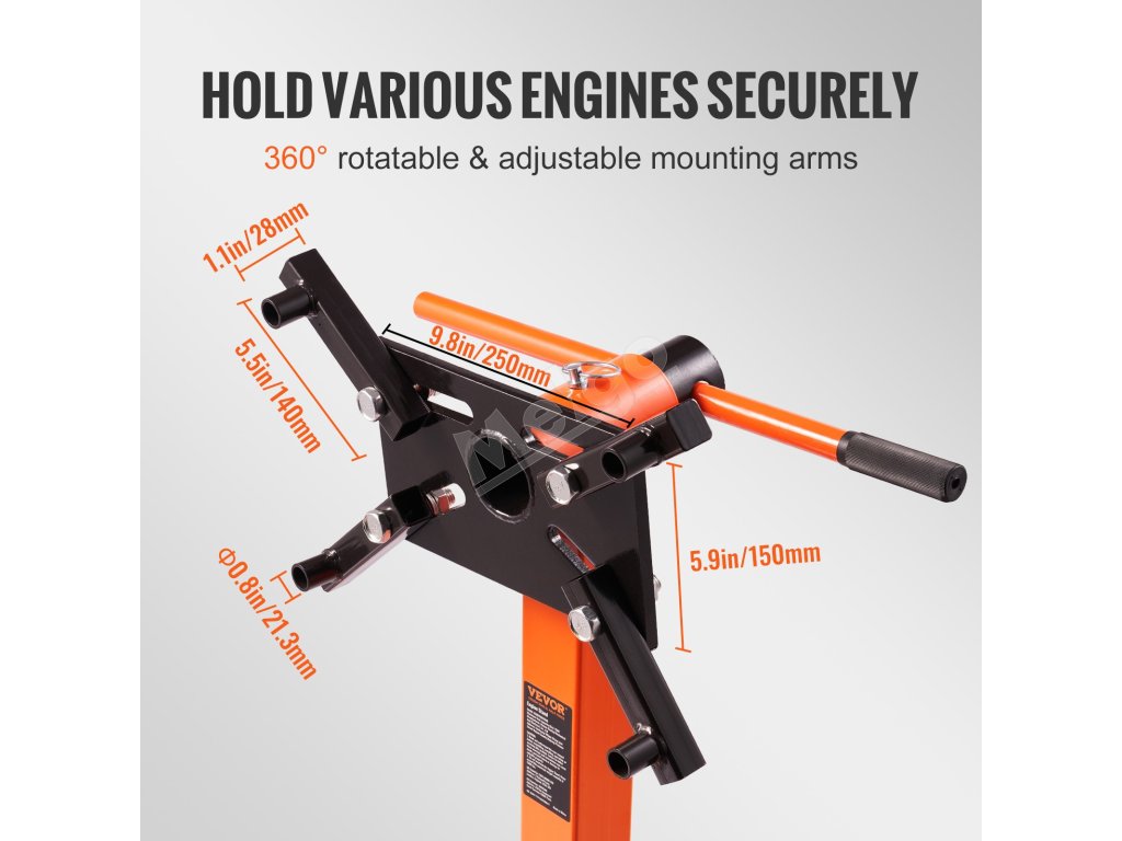 Stojan motora VEVOR je ideálny pre ťažké motory. Dokáže udržať až 1500 lbs. Vďaka tomu je ideálny pre rôzne veľkosti motorov. Robustná oceľová konštrukcia stojana zaisťuje stabilitu. Môžete sa naň spoľahnúť pri veľkých a ťažkých motoroch. Bezpečné upevnenie motora: Konštrukcia stojana umožňuje bezpečnú montáž motora. To zaručuje, že váš motor zostane počas údržby stabilný. Je to skvelá voľba na profesionálne použitie aj na domáce použitie. Pokoj na duši: Pri práci na vozidle sa už nemusíte obávať o stabilitu. To znamená, že vaše úlohy údržby sú jednoduchšie a bezpečnejšie.