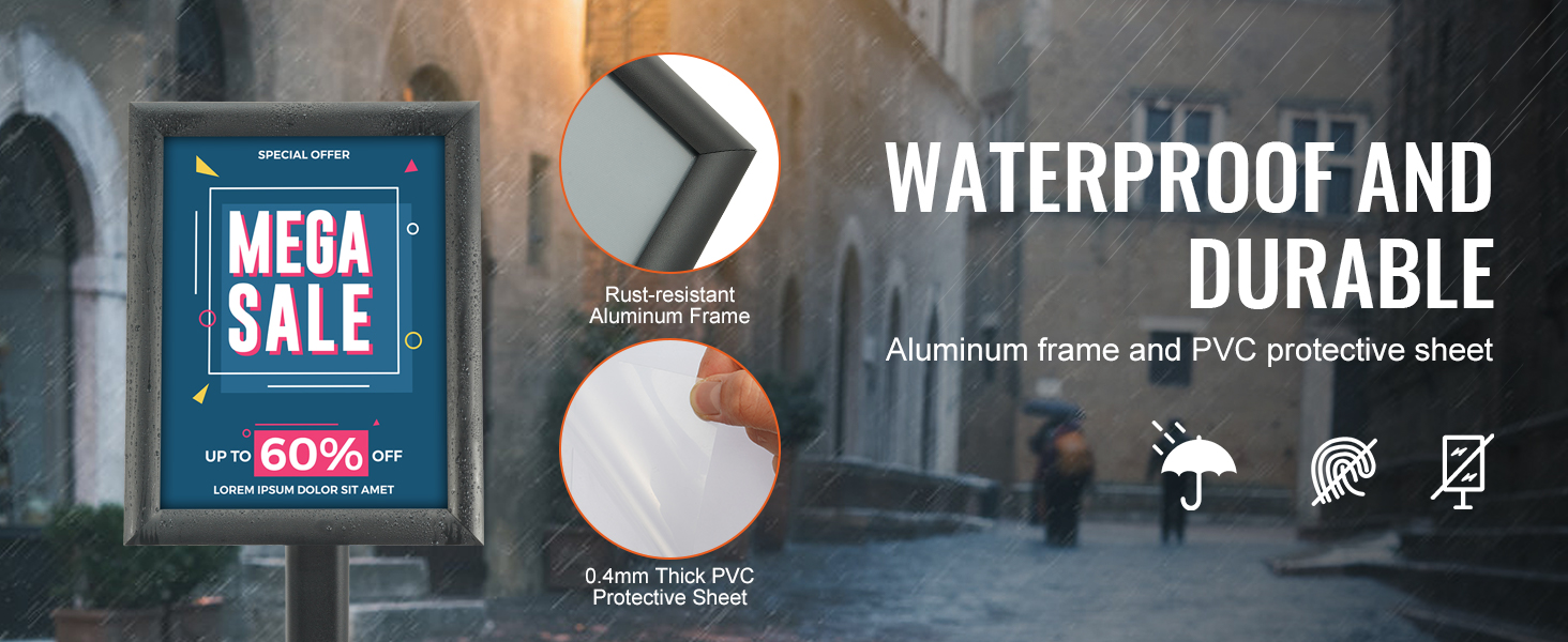 Stojan na plagáty s držiakom na nápisy je vyrobený z prvotriednych materiálov, má hliníkový rám a 0,4 mm ochrannú fóliu z PVC. To zaručuje trvanlivosť, vodotesnosť a odolnosť proti korózii. Vaše plagáty budú odolávať vplyvom počasia bez toho, aby sa stali krehkými alebo poškodenými.