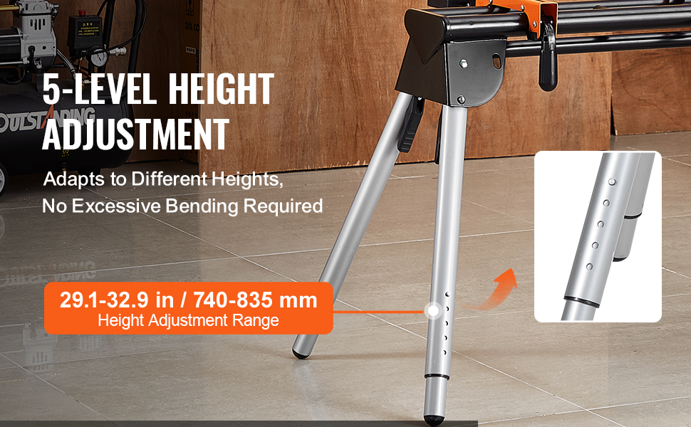 Používatelia rôznej výšky si môžu nájsť pohodlnú pracovnú polohu. Tento stojan na pokosovú pílu sa dá nastaviť tak, aby sa znížila únava z nadmerného ohýbania alebo naťahovania, od vysokých profesionálov až po kompaktných domácich majstrov.