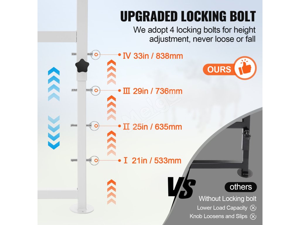 Náš stojan na dojenie kôz so 4 zosilnenými stĺpikmi a trojuholníkovou oporou rámu tvorí pevnú základňu. štvorúrovňovo nastaviteľná výška od 21" do 33" stolovej dosky zaručuje, že je vhodný pre malé kozy aj vysoké žrebce.