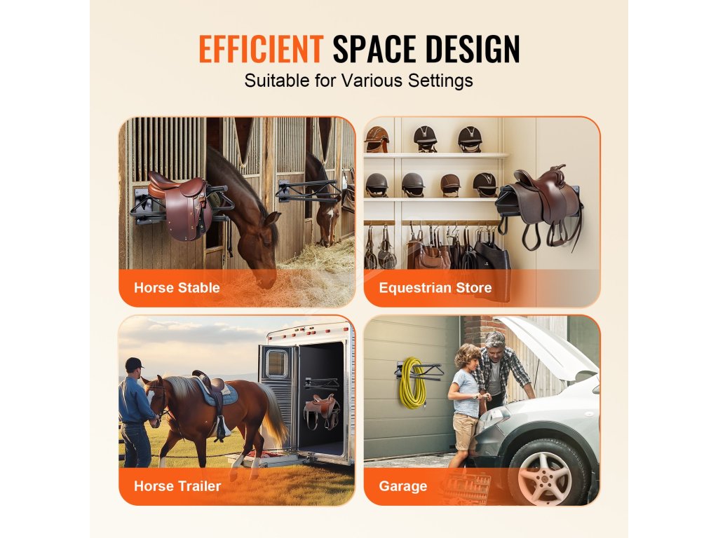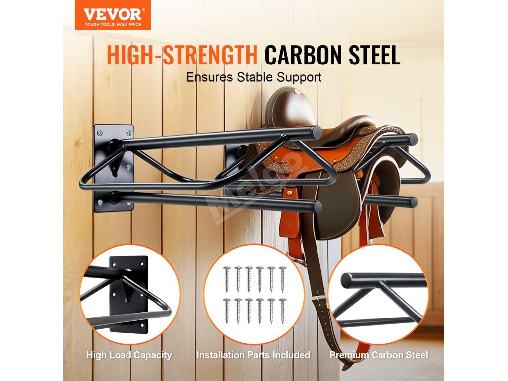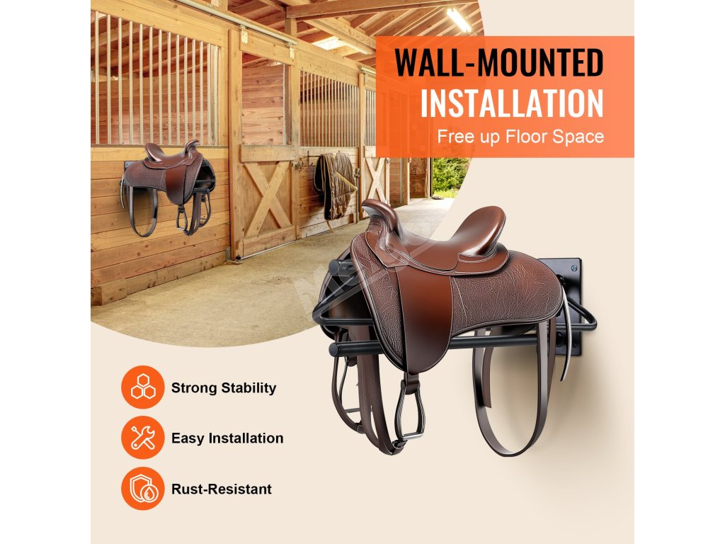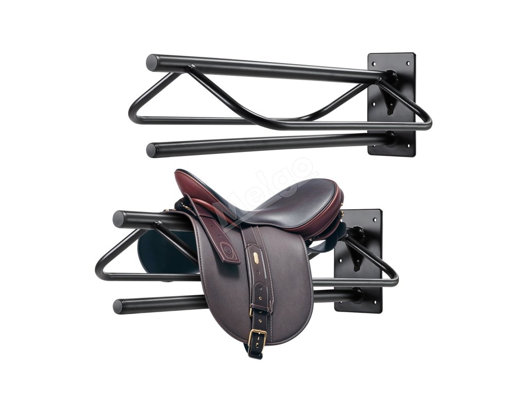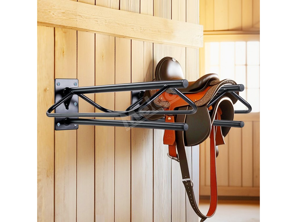 Rovný stojan na sedlo je vyrobený z vysokopevnostnej uhlíkovej ocele s úplným zváraním pre robustnú odolnosť. Jeho nástenný dizajn šetrí miesto a pojme anglické aj westernové sedlá, ako aj rôzne predmety, vďaka čomu je univerzálny pre rôzne nastavenia a optimalizuje váš priestor.