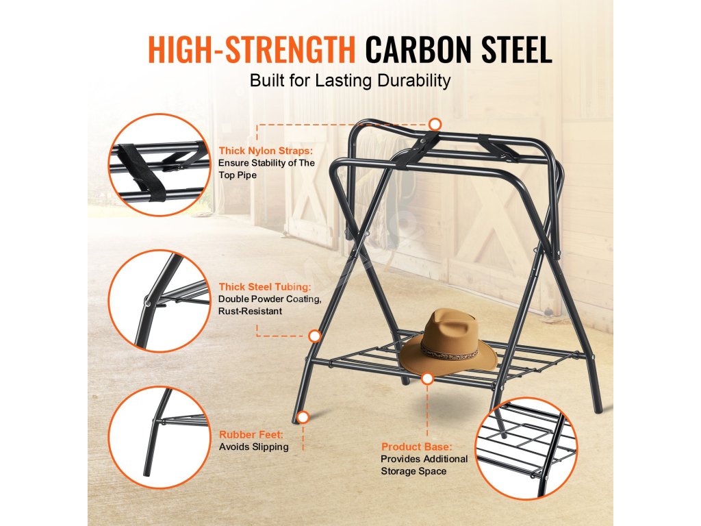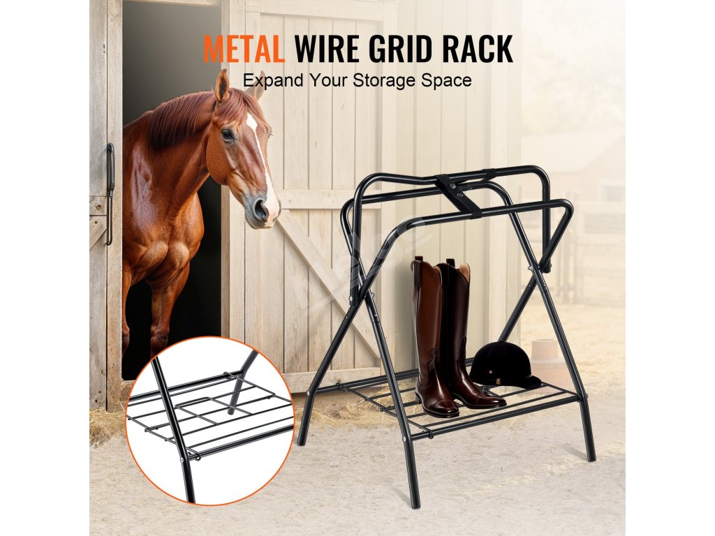 Tento stojan na sedlo sa môže pochváliť celooceľovou konštrukciou s úplným zváraním pre dlhú životnosť. Unesie až 132 kg, zmestia sa doň anglické aj westernové sedlá a zároveň udrží vaše sedlá v poriadku. Vďaka zacvakávacej konštrukcii je inštalácia jednoduchá a pohodlne sa skladá, aby sa ušetrilo miesto!