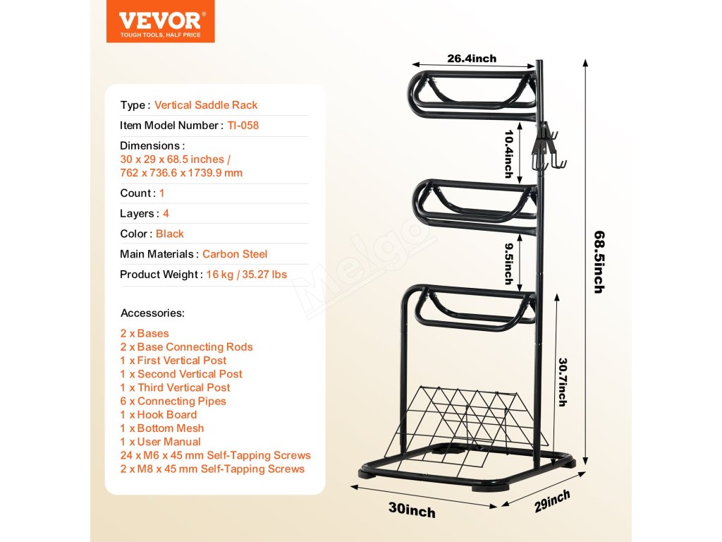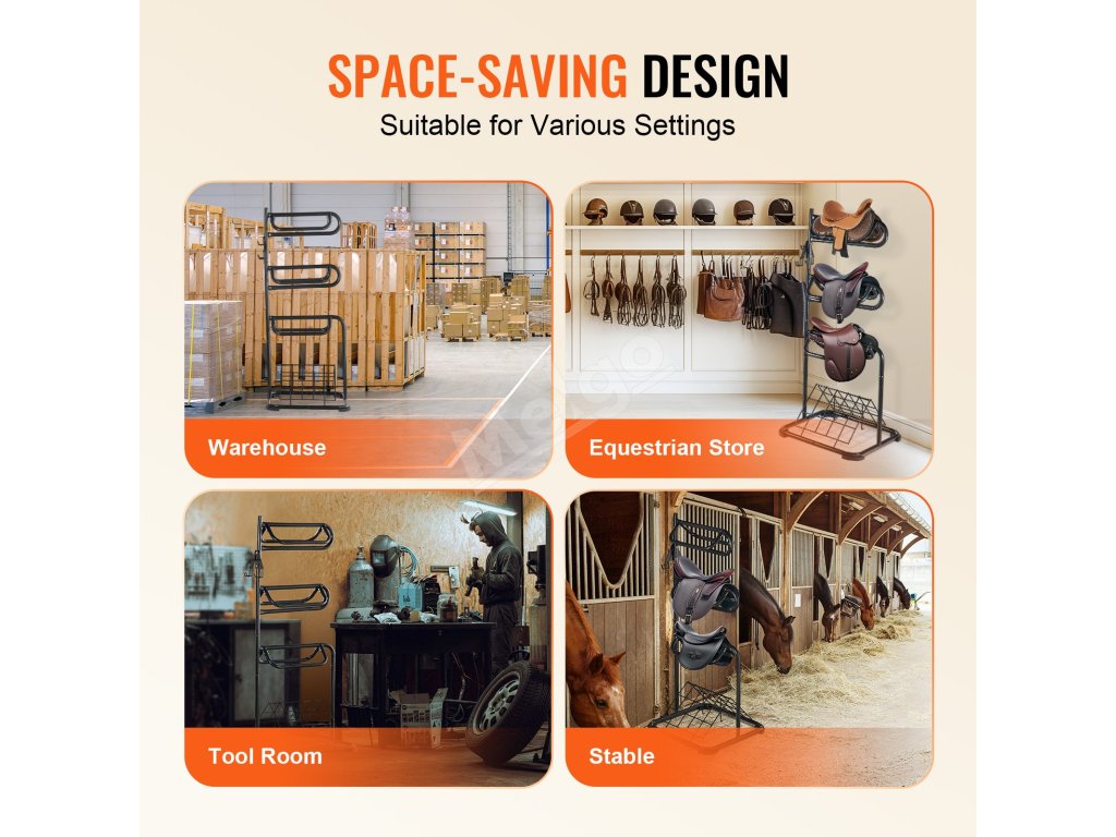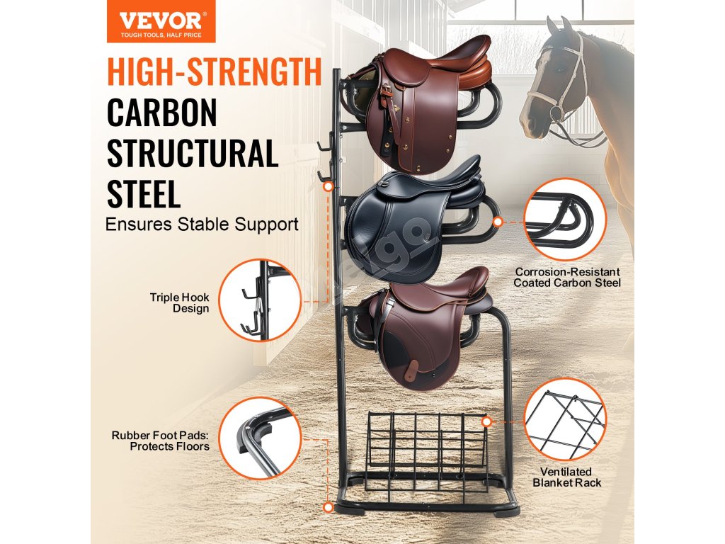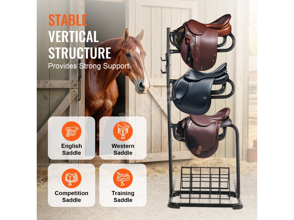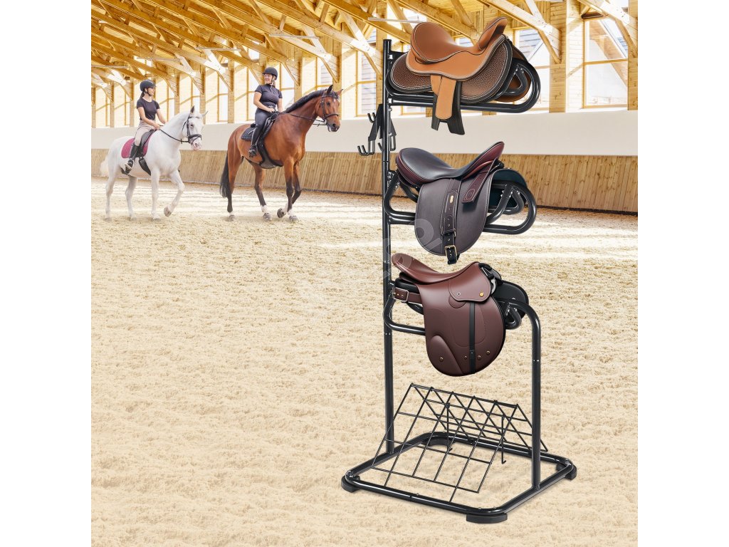 Tento štvorvrstvový stojan na sedlá má kompletnú oceľovú konštrukciu a úplné zváranie pre výnimočnú odolnosť. Ponúka dostatok priestoru pre všetky typy sediel a pojme rôzne sedlá, čím uľahčuje organizáciu a udržiava poriadok v stajni. Jasný návod na inštaláciu zaručuje bezproblémové nastavenie!