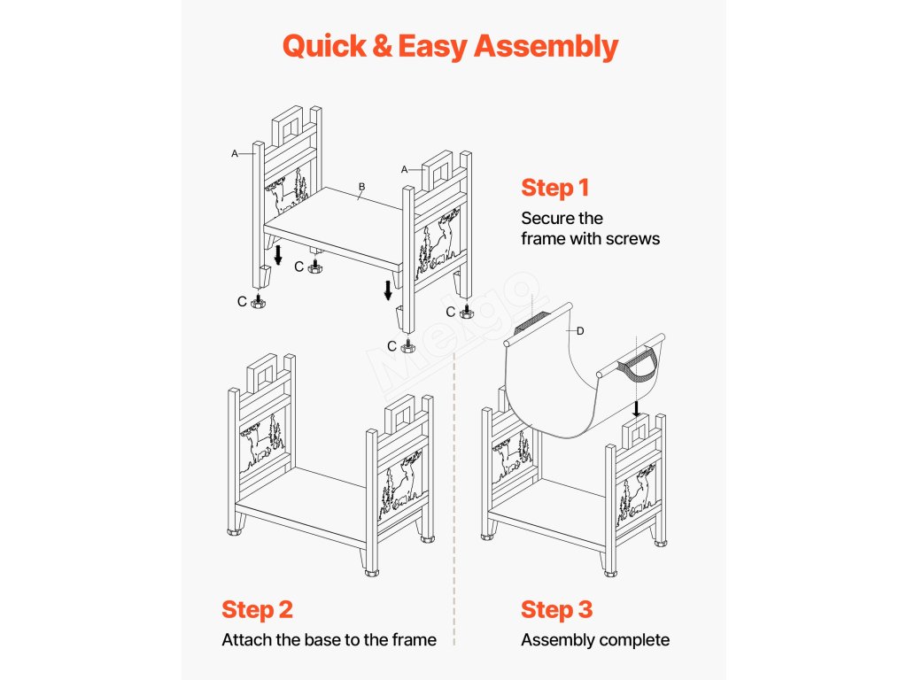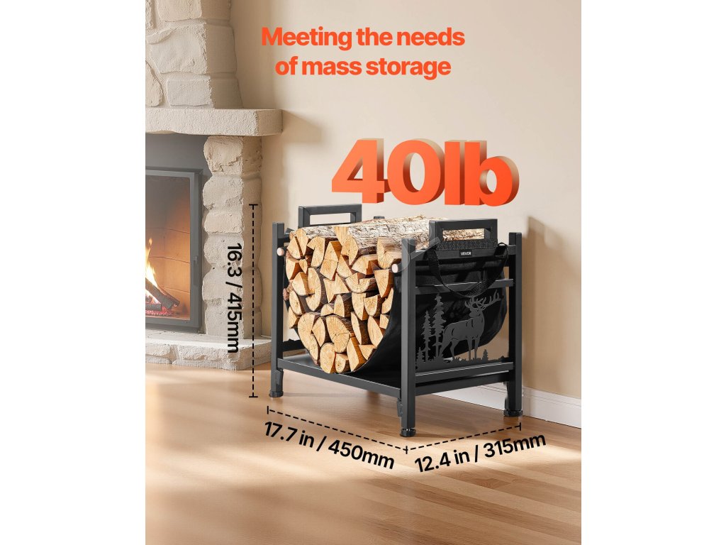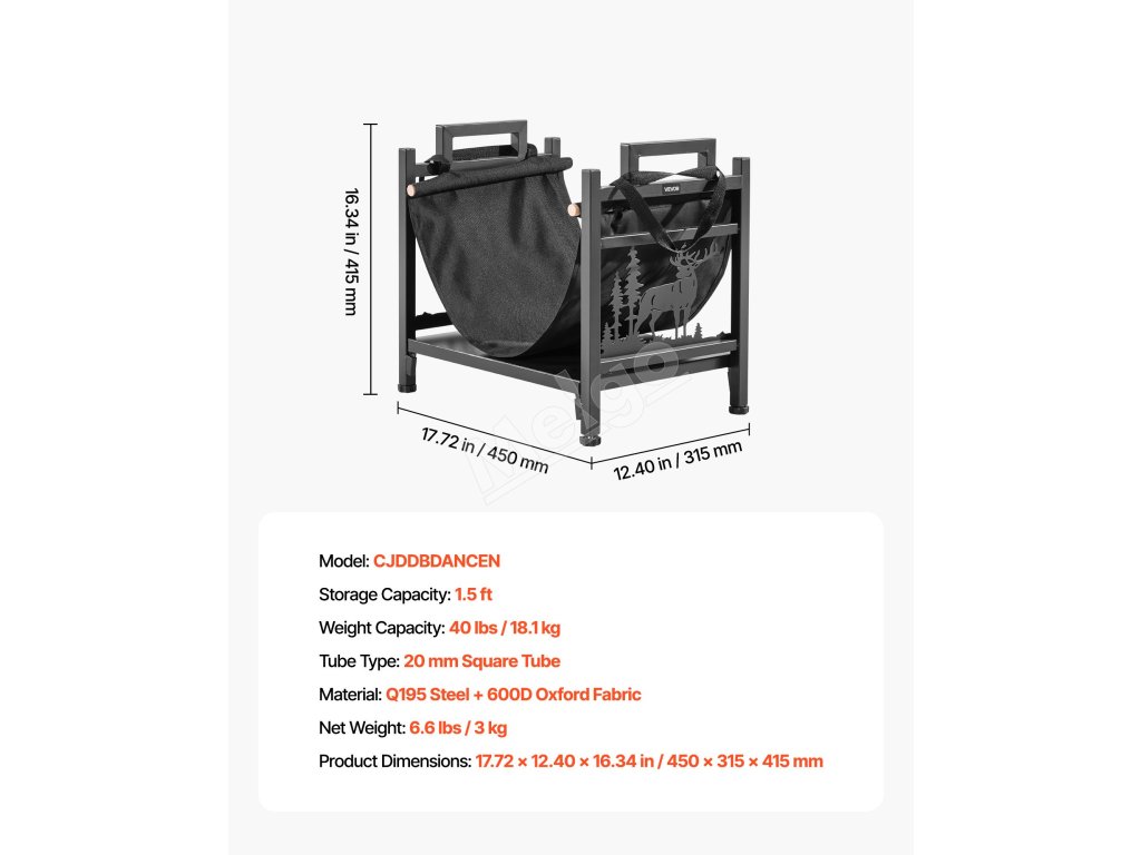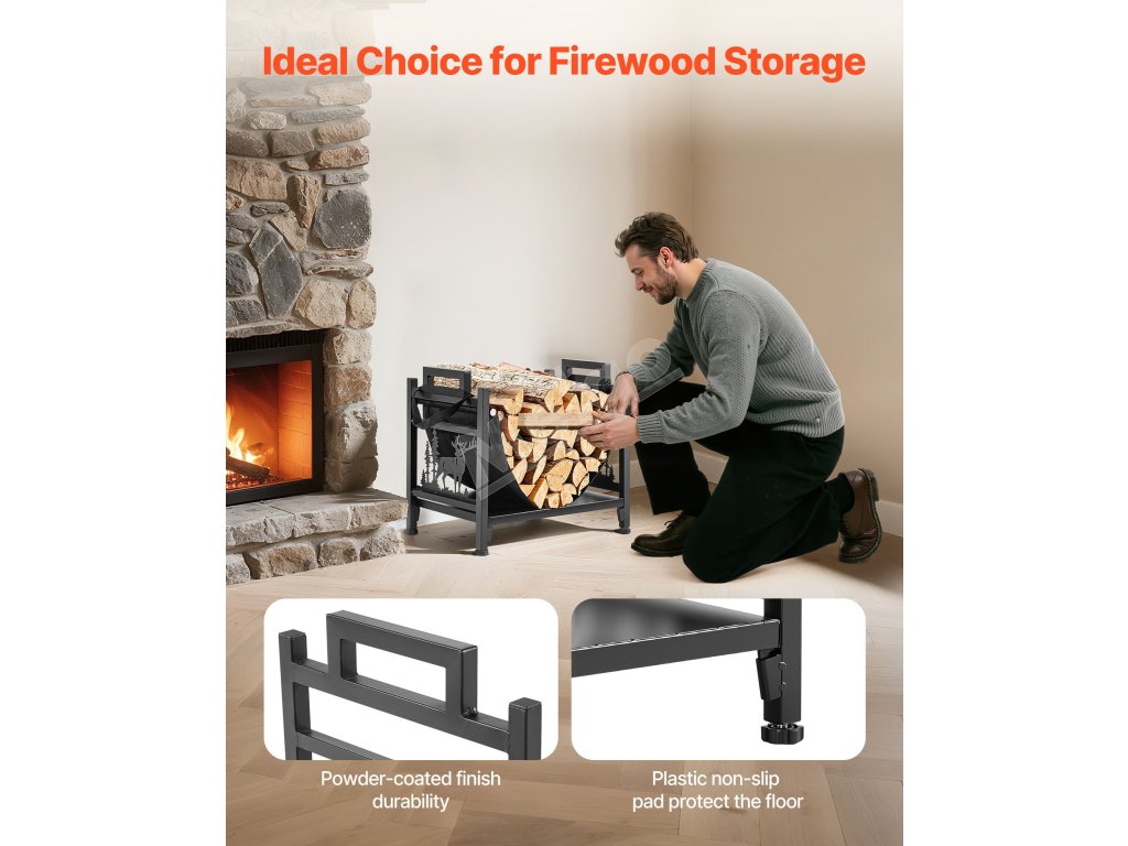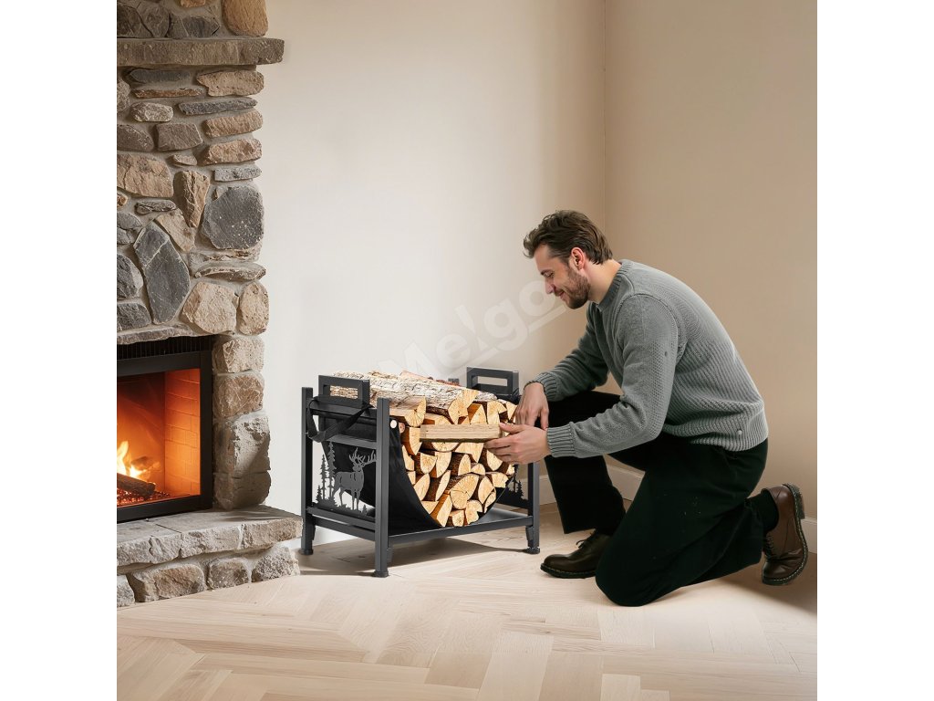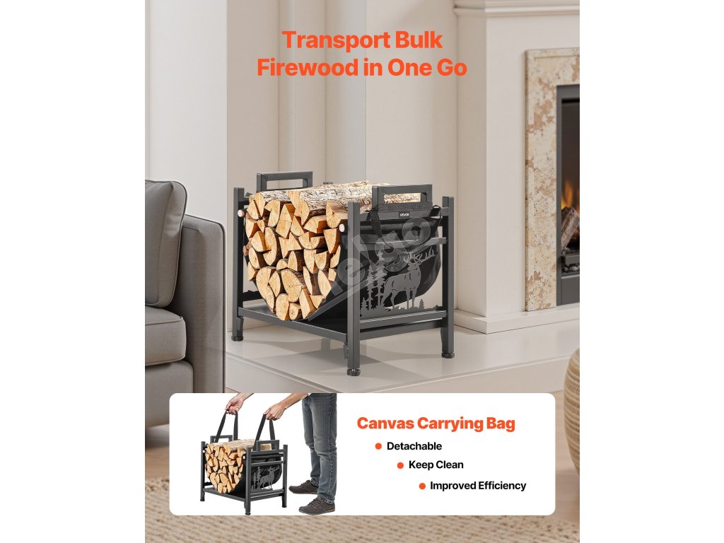 Tento stojan na palivové drevo, vyrobený z oceľových rúrok s práškovou povrchovou úpravou odolných voči poveternostným vplyvom, unesie až 40 kg a váži 6,6 kg. Jeho kompaktné rozmery sú vhodné pre krby, kachle na drevo a vonkajšie ohniská, pričom pojme 10 - 20 polien - dosť na 4 - 5 hodín horenia. Súčasťou je plátenná taška na prepravu dreva na jednu cestu.