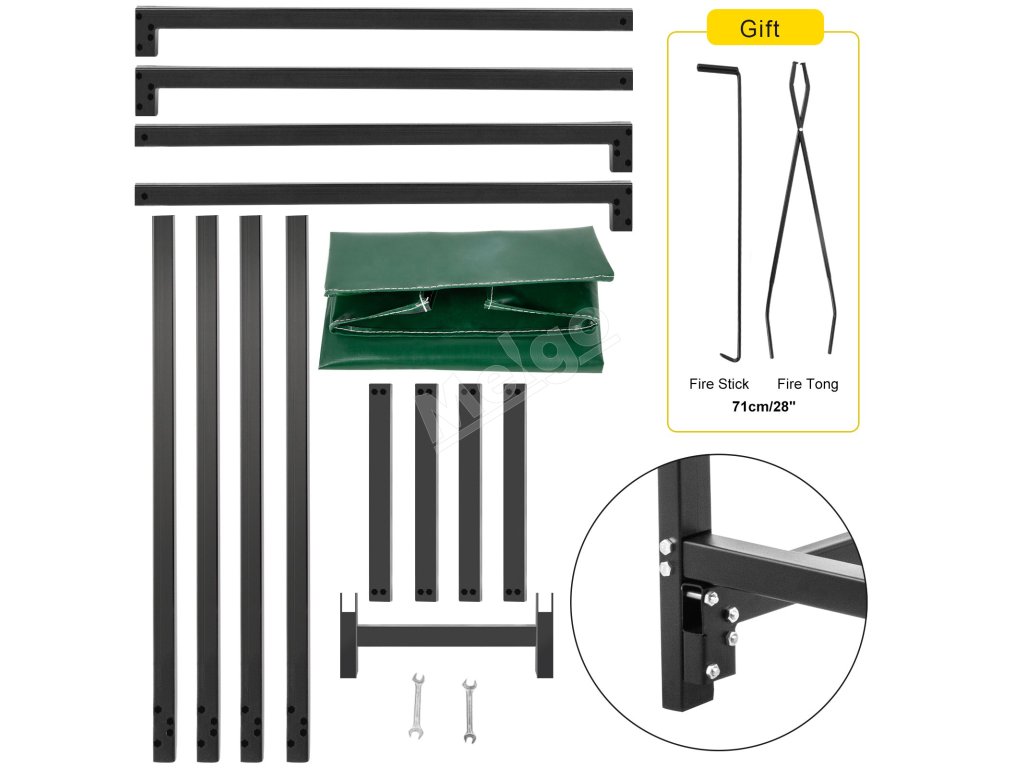 Vyrobený z vysokopevnostnej štvorcovej ocele, vonkajší stojan na polená má hrúbku rúrky 2 mm/0,08"; veľkosť hlavnej rúrky: 1,2 "x2"; veľkosť nosnej rúrky: 1,6 "x1,6". A 1x 34 cm/13,4" stredová rúrka.