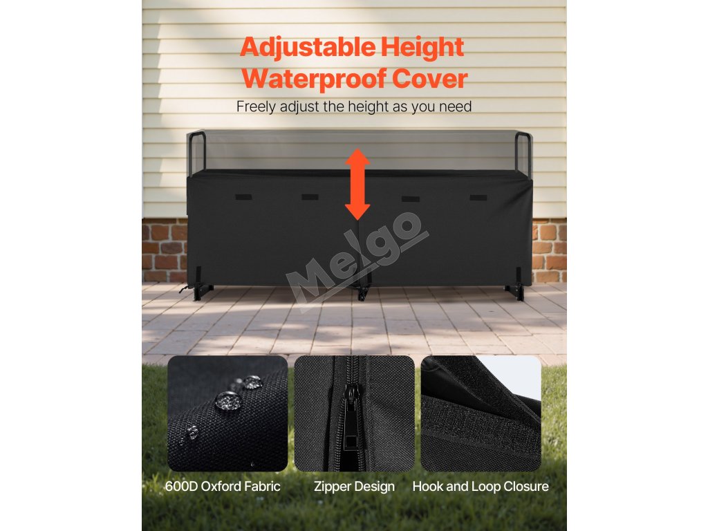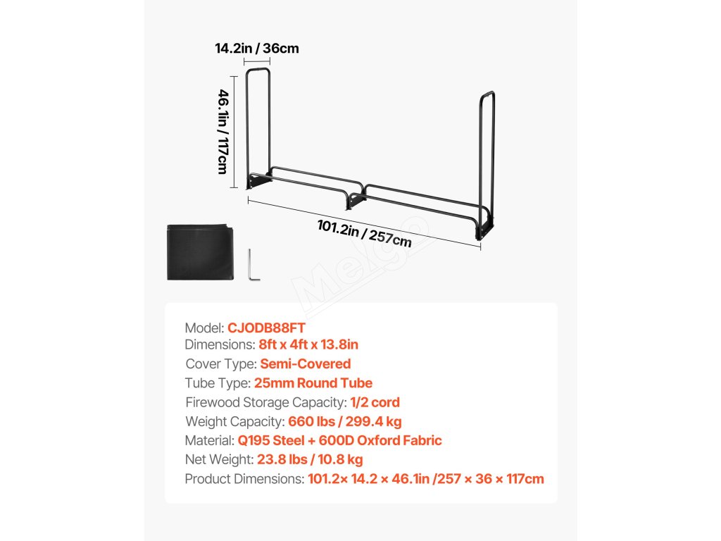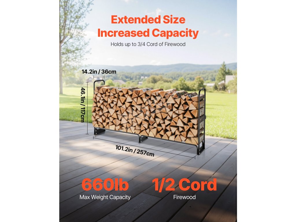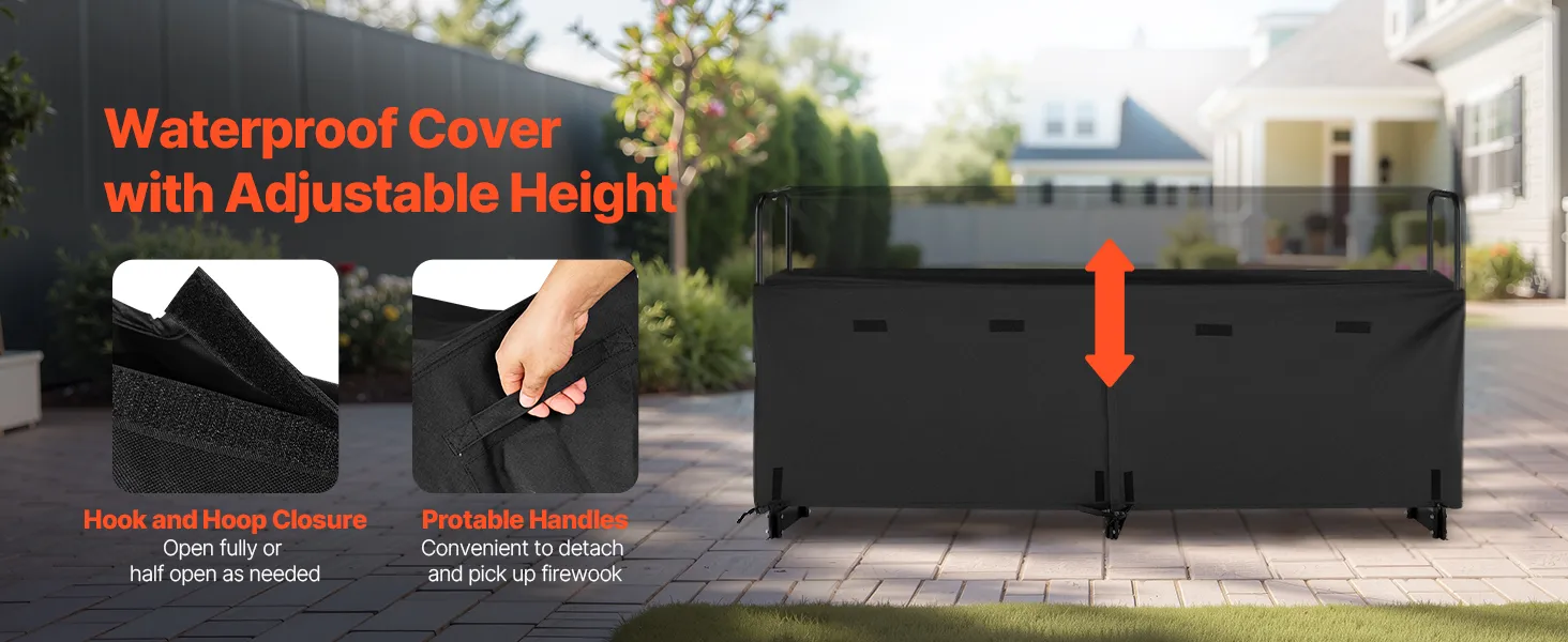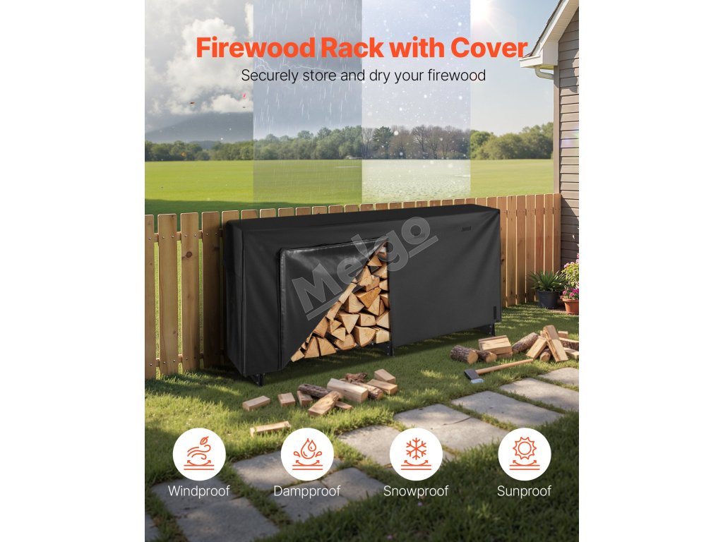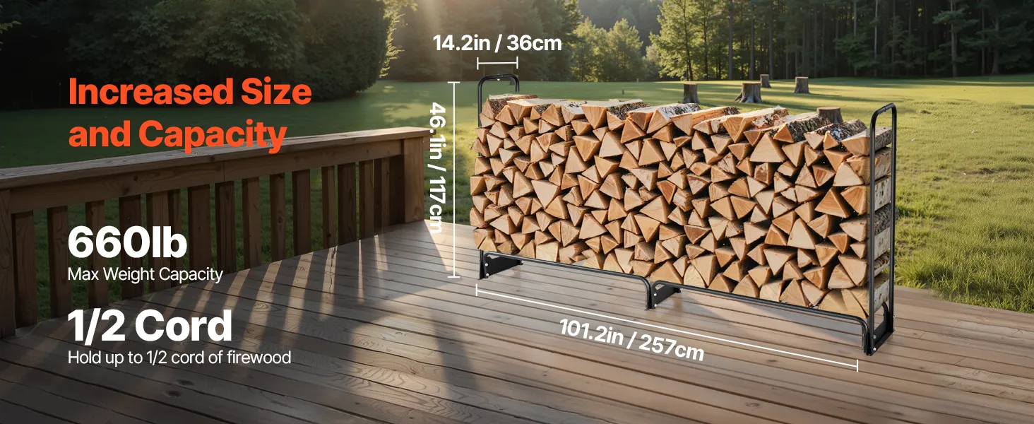 Tento ťažký stojan na palivové drevo unesie až 660 kg a pojme až 1/2 šnúry dreva. Je vybavený vodotesným a UV žiareniu odolným krytom, ktorý odolá slnku, dažďu aj snehu. Tento stojan je ideálny na verandy, záhrady, terasy a ďalšie miesta, kde udrží vaše palivové drevo v suchu, dobre vetrané a kedykoľvek pripravené na použitie.
