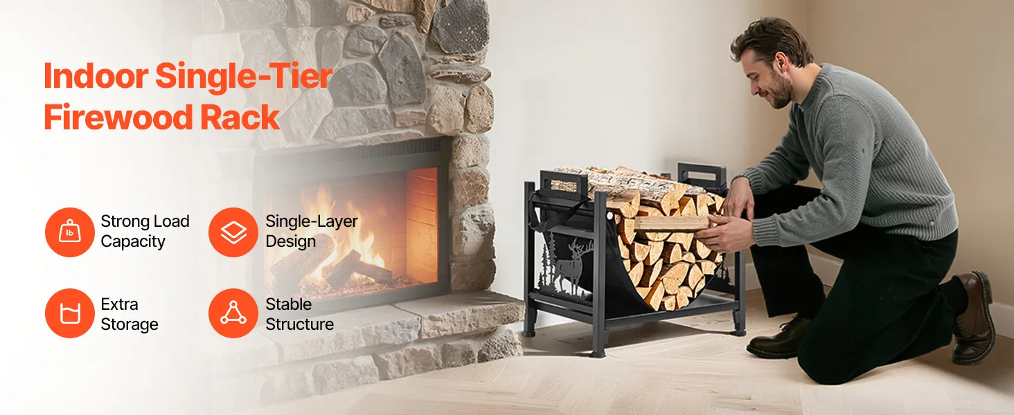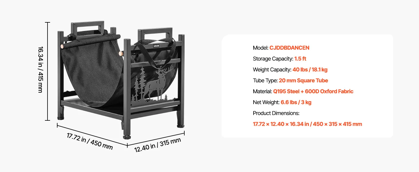 Tento stojan na palivové drevo, vyrobený z oceľových rúrok s práškovou povrchovou úpravou odolných voči poveternostným vplyvom, unesie až 40 kg a váži 6,6 kg. Jeho kompaktné rozmery sú vhodné pre krby, kachle na drevo a vonkajšie ohniská, pričom pojme 10 - 20 polien - dosť na 4 - 5 hodín horenia. Súčasťou je plátenná taška na prepravu dreva na jednu cestu.