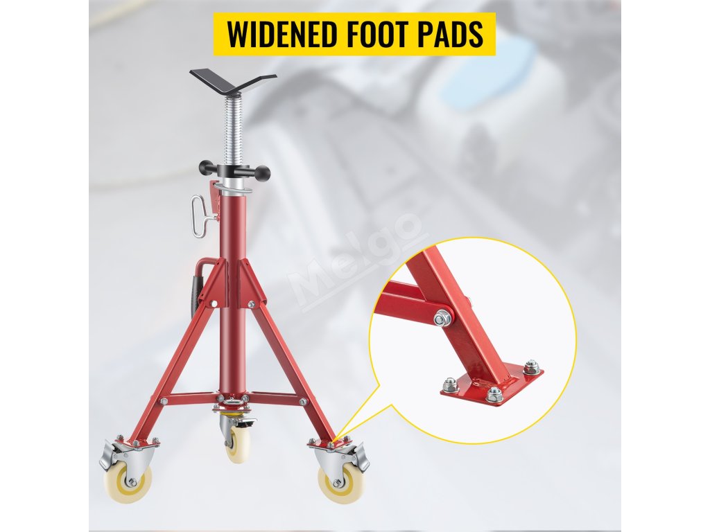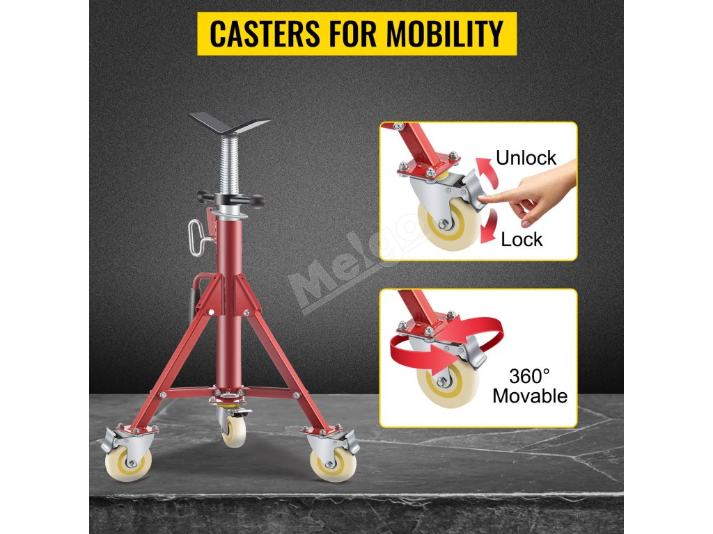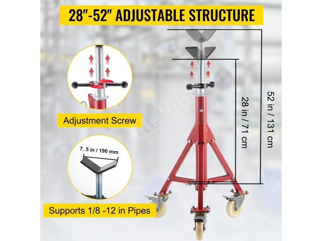 Výška tohto stojanu na zdvihák je nastaviteľná od 28"/71 cm do 52"/131 cm. V-hlava je vhodná pre rúry s rozmermi 1/8 až 12 palcov/0,32 až 30,48 cm.