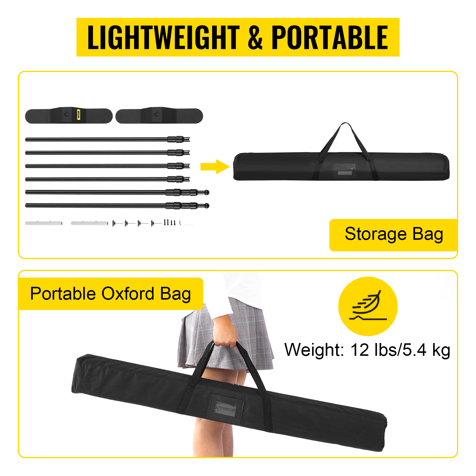 Celá súprava je zabalená v prenosnej oxfordskej taške, ktorá šetrí miesto pri skladovaní a častom cestovaní. Stojan na pozadie na večierky sa dá s hmotnosťou 12 lbs/5,4 kg ľahko preniesť kamkoľvek.
