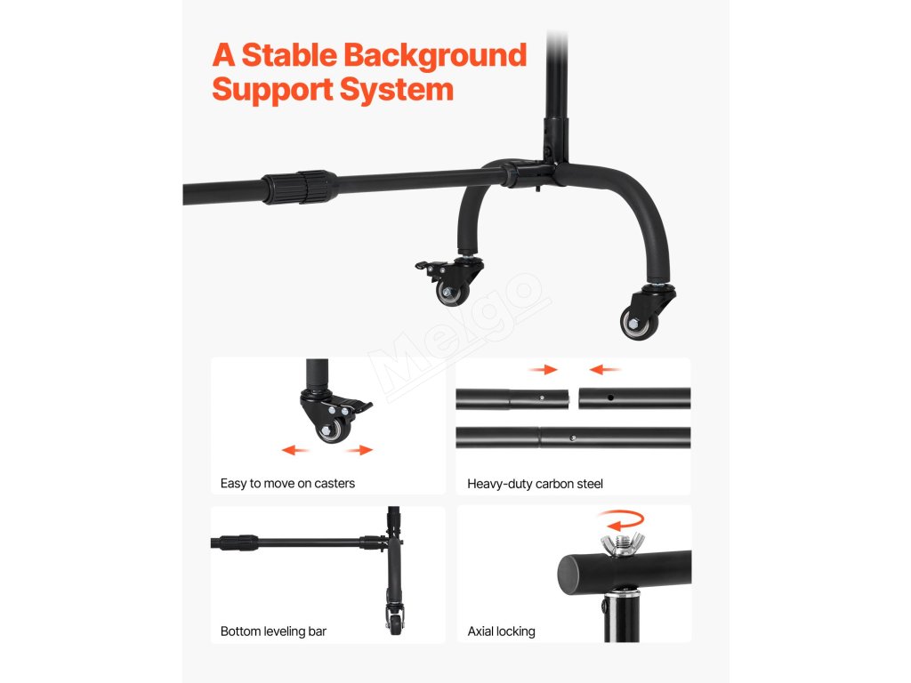 Tento stojan na pozadie má pohyblivú základňu a horizontálnu tyč na zvýšenie stability. Jeho nastaviteľná veľkosť je vhodná pre veľké pozadia a je ideálny pre štúdiá, domáce použitie, hotely a pódiá.
